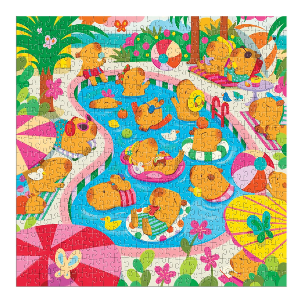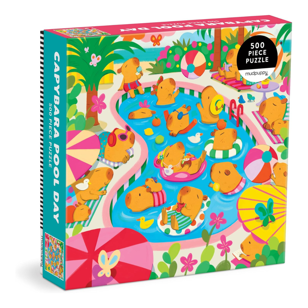 Capybara Pool Day is a 500 piece jigsaw puzzle from Mudpuppy that brings calm vibes and sunny scenes to life! With charming illustrations of capybaras lounging, splashing and floating in their favourite watering hole, this puzzle offers the perfect balance of challenge and relaxation.