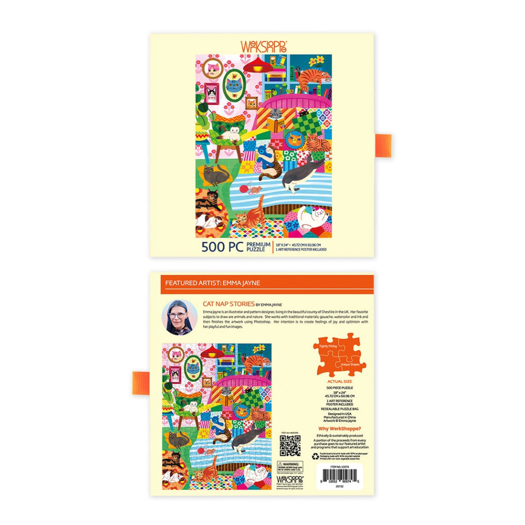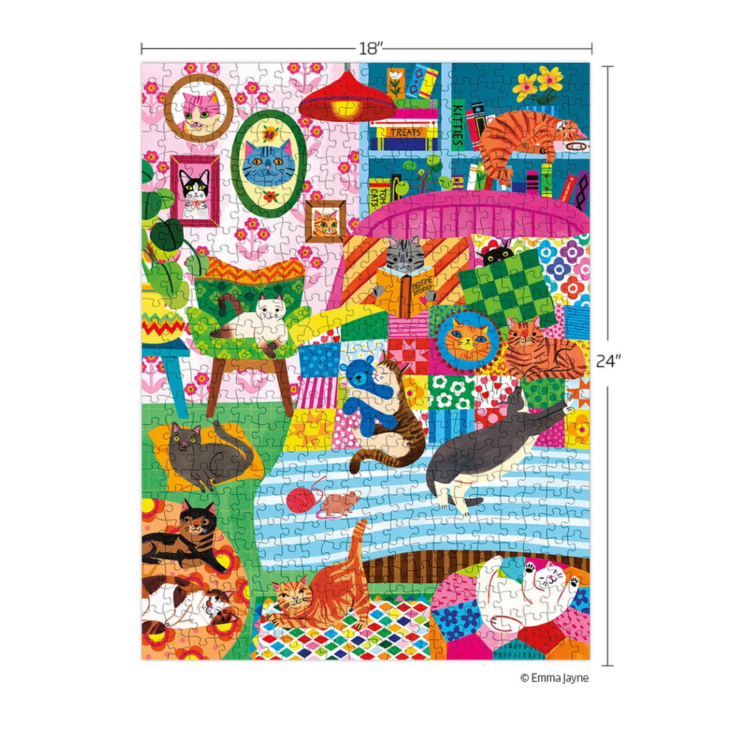 Cat Nap Stories 500 piece jigsaw puzzle brings a cozy, colourful world to life, filled with cats of every shape and shade settling in for the perfect snooze. The quirky bedroom scene is packed with playful patterns, whimsical decor and tiny details that make the puzzle feel warm and lived in. It's a vibrant, feel-good challenge that keeps you smiling as you piece together every sleepy feline.