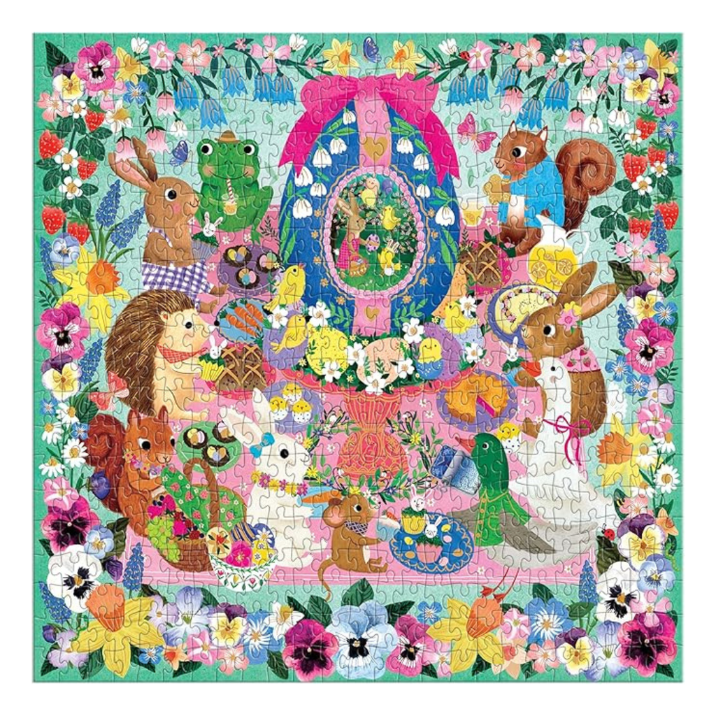 The Egg-cellent Day 500 piece jigsaw puzzle from Mudpuppy invites you to assemble a delightful scene featuring woodland creatures enjoying a festive Easter picnic. At the centre of this charming scene is a beautifully decorated sugar egg, surrounded by playful bunnies, squirrels and birds. This puzzle offers just the right level of challenge for both kids and adults, making it a perfect family activity.
