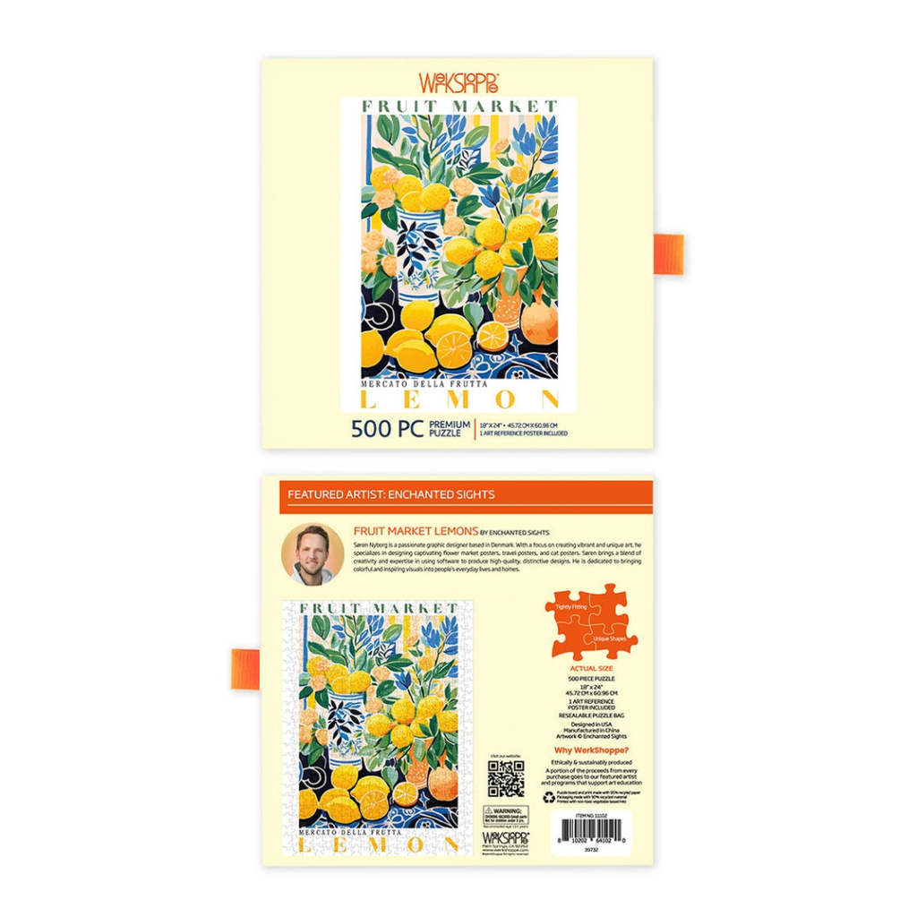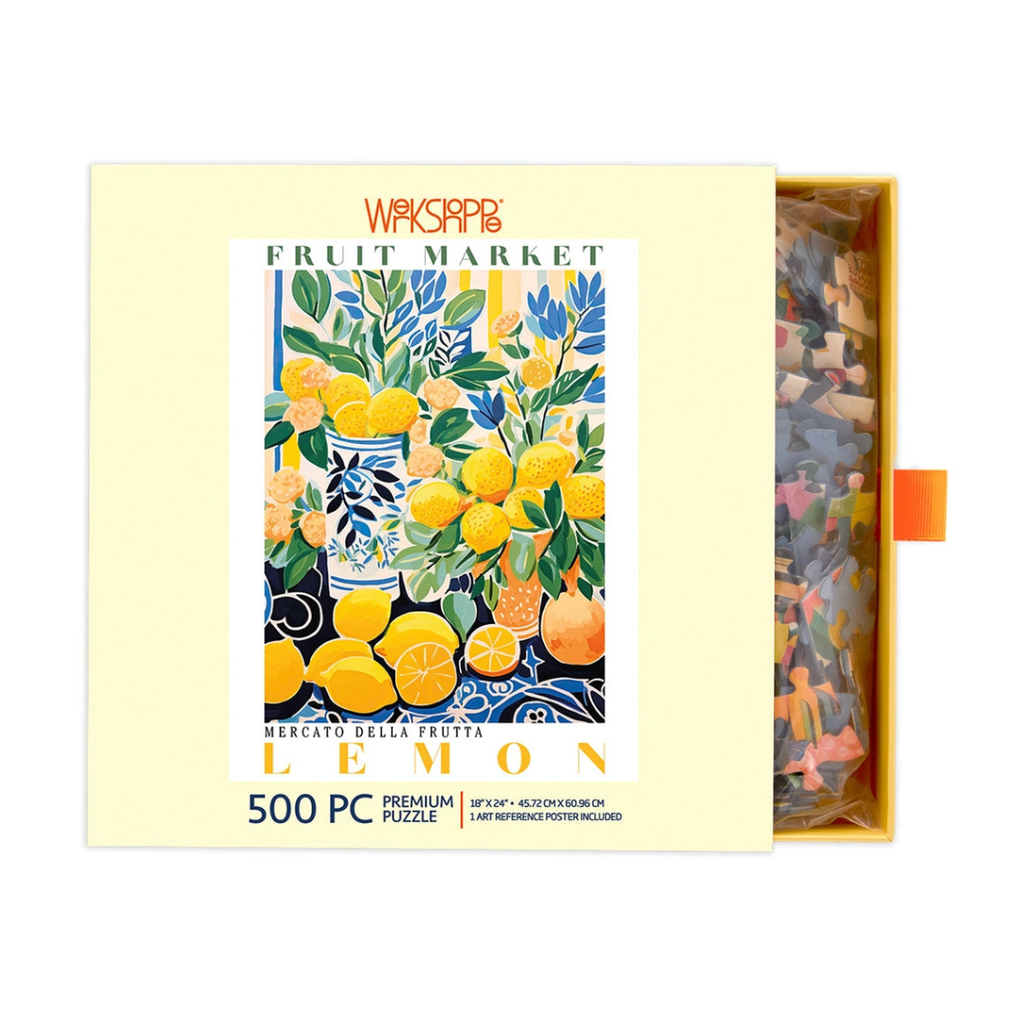Bring a burst of sunshine to your table with the Fruit Market Lemons 500 piece jigsaw puzzle. This bright, Mediterranean-inspired scene features lush lemon branches, citrus blossoms and beautifully patterned ceramic vases arranged in a lively fruit market display. With vibrant yellows, deep greens and bold blue accents, it's a refreshing, feel-good puzzle that delivers pure visual joy.