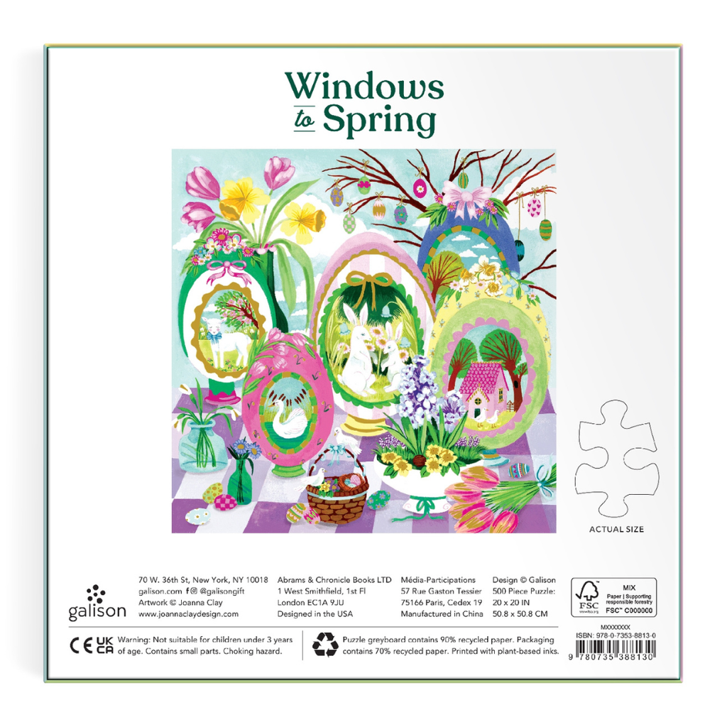 Celebrate the sweetest signs of spring with the Windows To Spring 500 piece foil jigsaw puzzle from Galison. This delightful puzzle features a colourful collection of intricate sugar eggs, each showcasing tiny, enchanting scenes tucked inside - think adorable sheep, graceful swans, cozy cottages and blooming gardens.