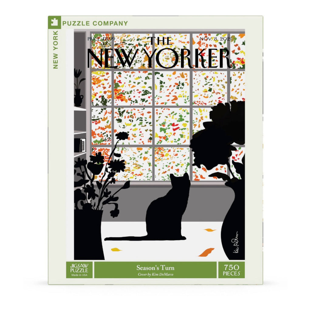 Embrace the quiet beauty of fall with Season’s Turn, a 750 piece jigsaw puzzle featuring the November 8, 2021 cover of The New Yorker by Kim DeMarco. This striking image captures a black cat sitting in a monochrome apartment, gazing out a window at a colourful cascade of autumn leaves. The vivid reds, oranges, greens and yellows of the falling leaves create a stunning contrast against the stark black-and-white interior, highlighting the changing seasons in a moment of stillness and reflection. A thoughtful, artful puzzle perfect for cat lovers, autumn enthusiasts and fans of modern illustration.
