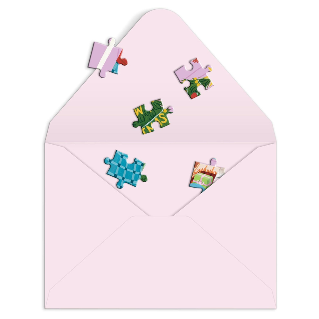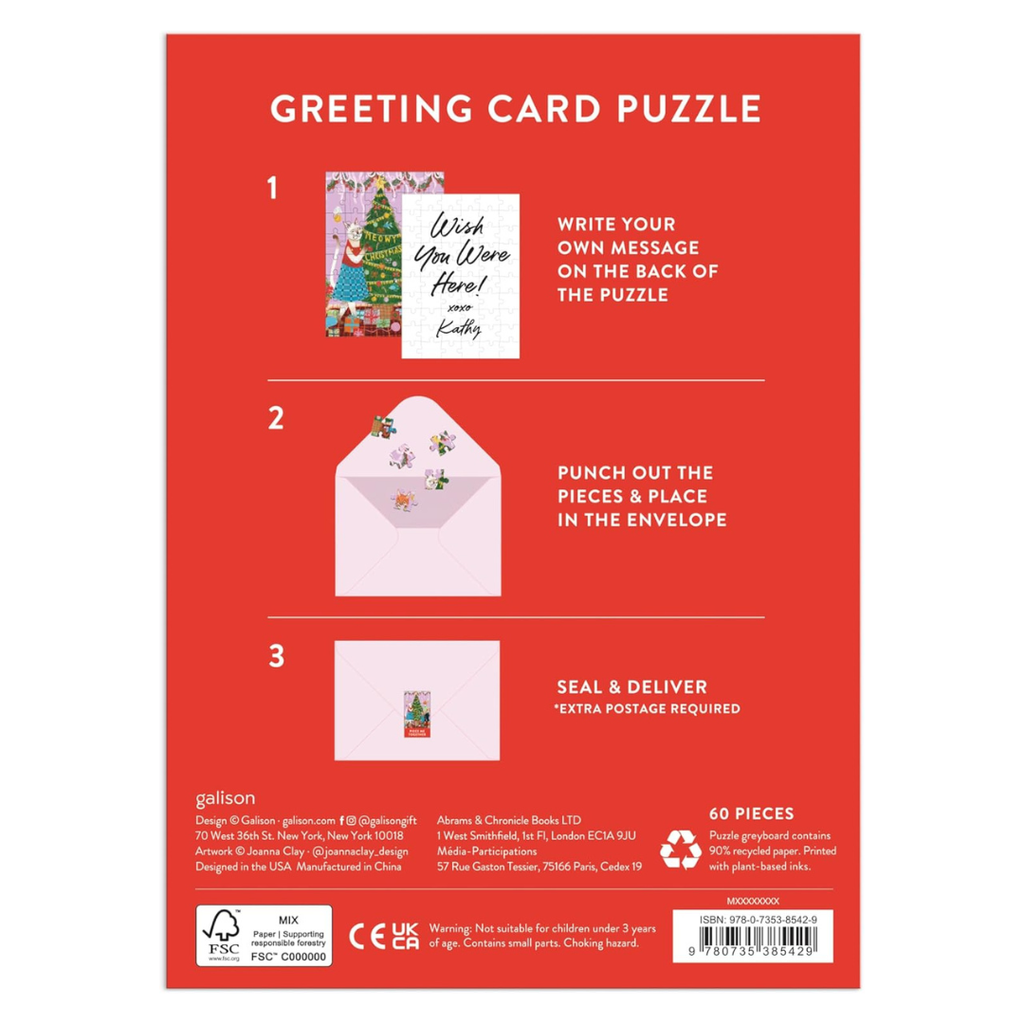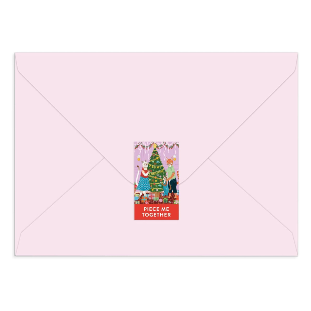 The Meowy Christmas greeting card puzzle from Galison is the perfect accompaniment to any gift or present! The design captures the charm of the holidays in a cozy kitty living room, decorated for Christmas. After writing a personal greeting on the back of the card, one can then break up the puzzle and send the pieces to a friend, colleague or loved one to puzzle together and read your message.