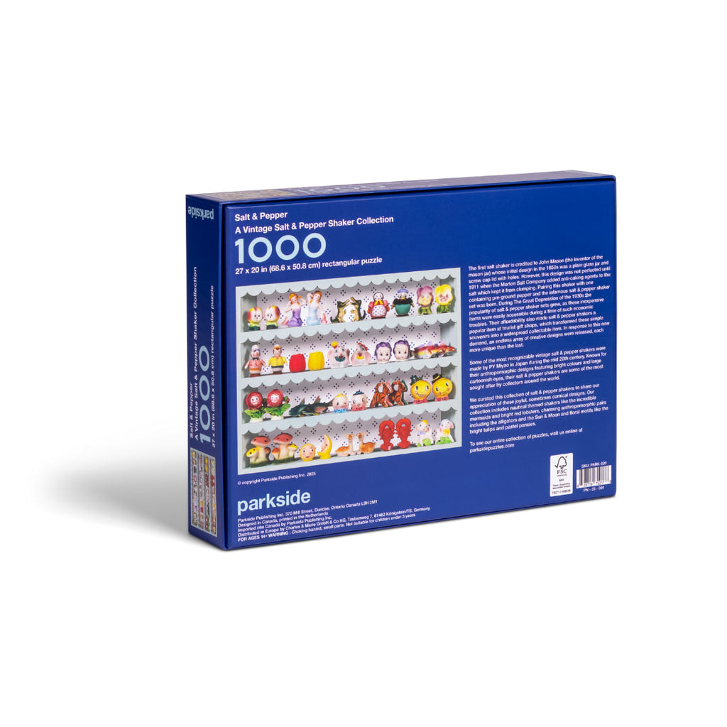 With their origins as early as 1850, salt shakers and subsequently salt & pepper shaker sets have been a common household item for decades. Their affordability also made salt & pepper shakers a popular item at tourist gift shops, which transformed these simple souvenirs into a widespread collectable item. In response to this demand, an endless array of creative designs have been released, each more unique than the last. This 1000 piece jigsaw puzzle features Parkside's collection of salt & pepper shakers. These joyful, sometimes comical designs include nautical themed shakers like the incredible mermaids and bright red lobsters, charming anthropomorphic pairs including the alligators, and the Sun & Moon and floral motifs like the bright tulips and pastel pansies.