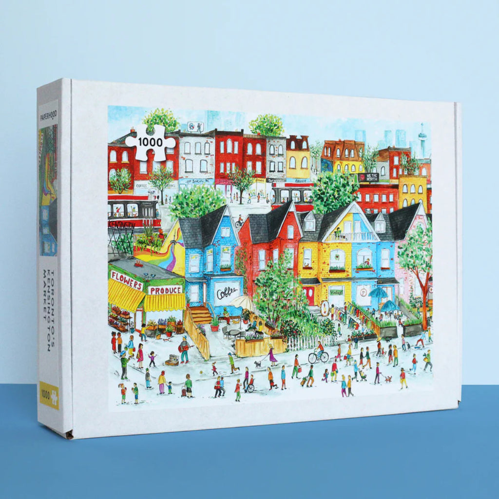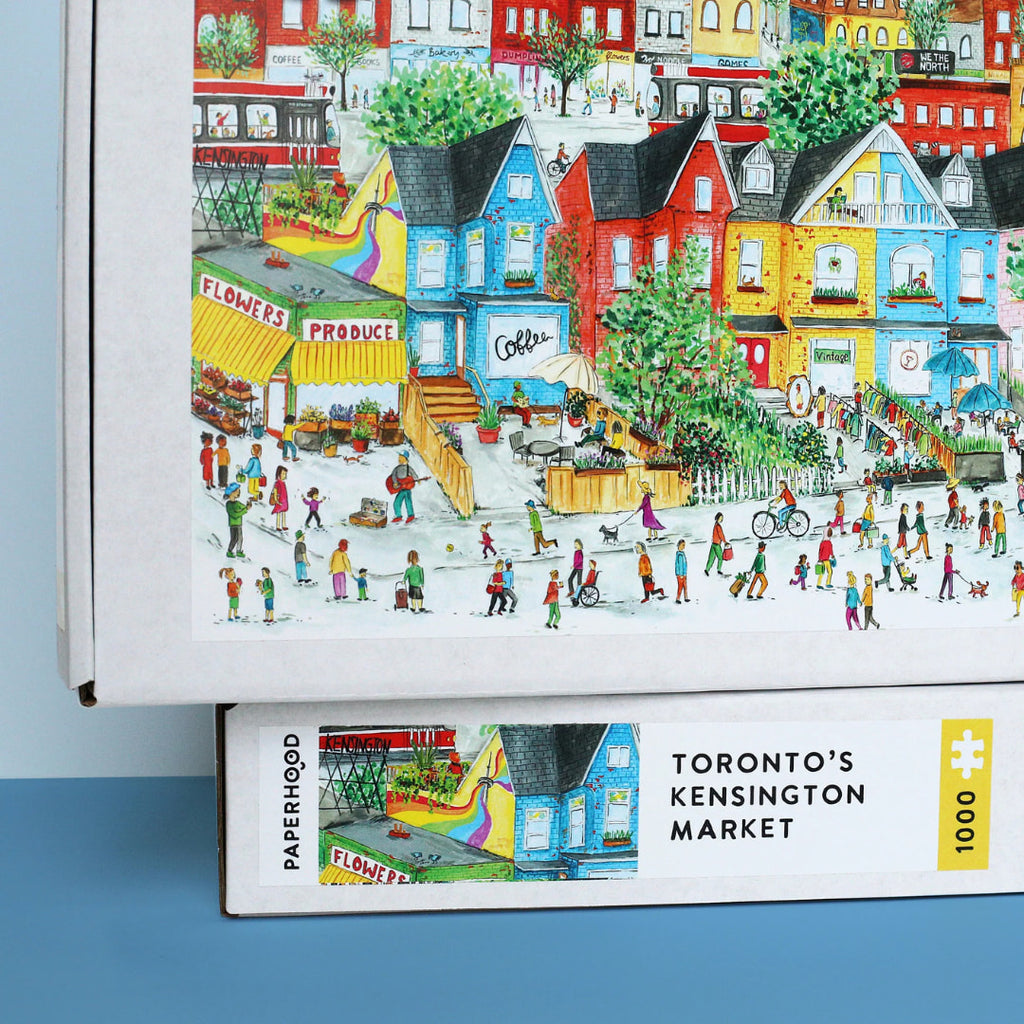 Toronto's Kensington Market is bustling in this 1000 piece jigsaw puzzle, a celebration of life in the big city! Enjoy building this vibrant scene, full of nods to Toronto life like the Blue Jays, the Raptors, the iconic streetcar, Chinatown, raccoons and landmarks like Grossman's Tavern, the CN Tower and the SkyDome.