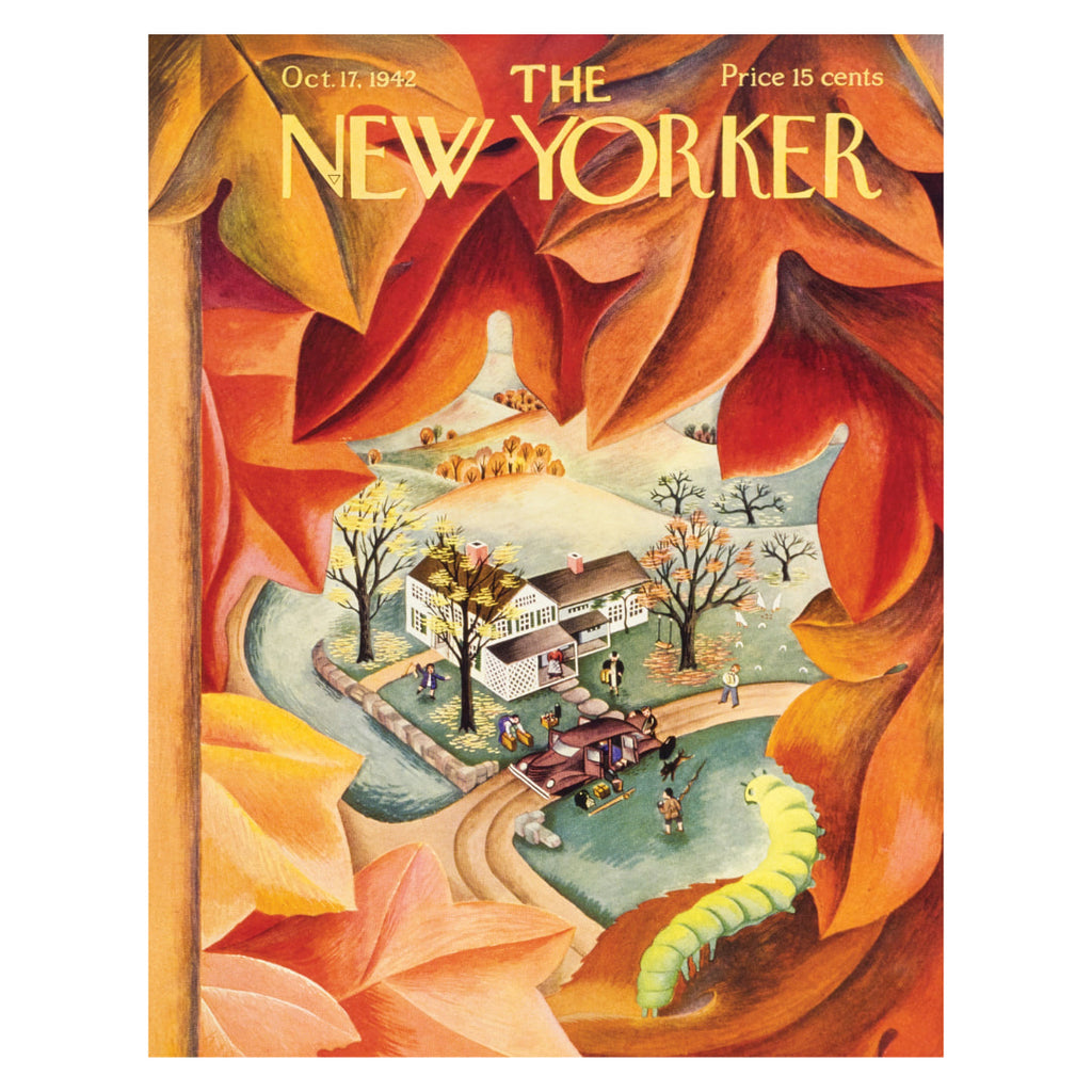 Step into the heart of fall with the Autumn View 100 piece mini jigsaw puzzle, showcasing the October 17, 1942 cover of The New Yorker. This warm, nostalgic illustration captures a scenic countryside moment framed by vibrant autumn leaves. A bustling farmhouse scene unfolds below—complete with visitors, harvest activity and charming rural details—inviting you to celebrate the season’s simple pleasures.