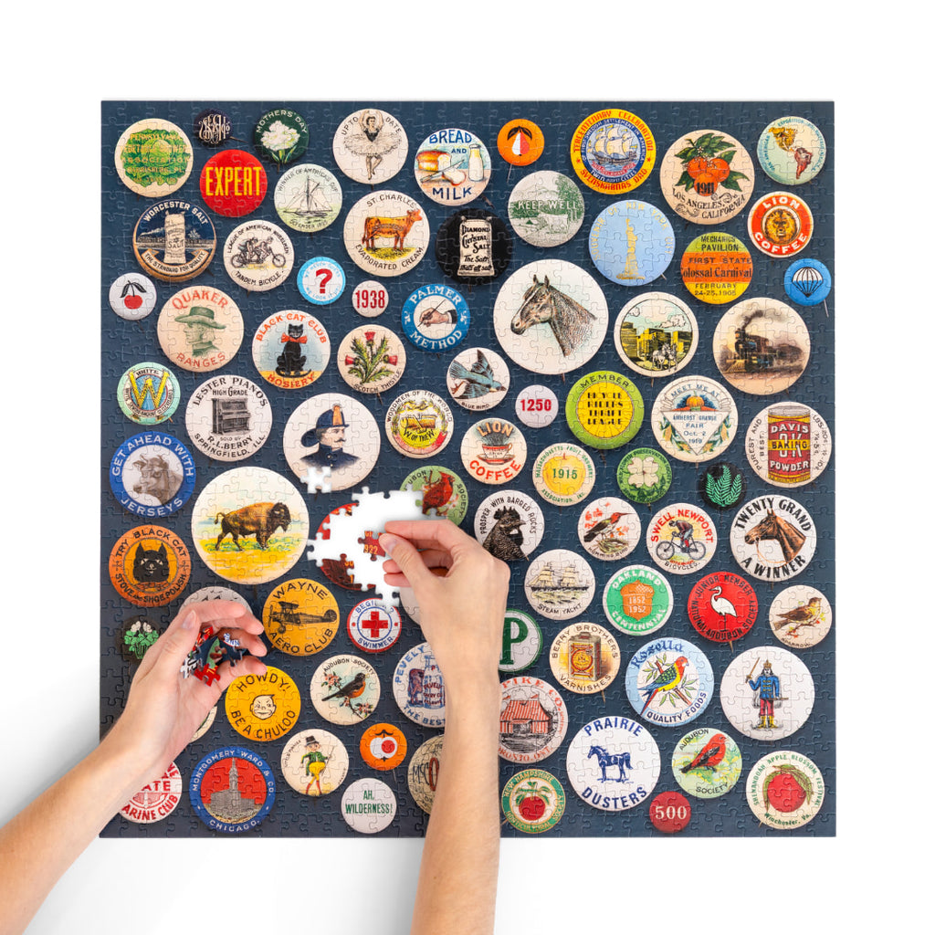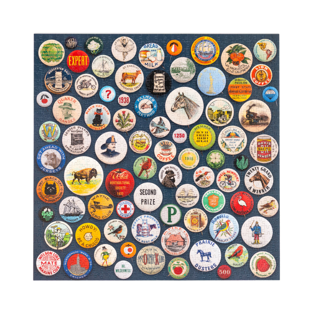 The first design for a pinback button was patented in 1896 by the New Jersey firm Whitehead & Hoag. Although variations of lapel pins date back to as early as the late 1700s, it was Whitehead & Hoag who innovated the design by inserting a sheet of transparent film made of celluloid over a photograph mounted on a badge to protect the image from scratches and abrasion. Industrial advancements at the time, in both printing and metal stamping made the pinback button an affordable object to produce so its popularity soared soon after its invention. Enjoy this 1000 piece puzzle of Parkside's fun collection of vintage pushback buttons. From horses and boats to state fairs and advertisements, the collection features an incredible selection of buttons from the 1890s to 1950s.