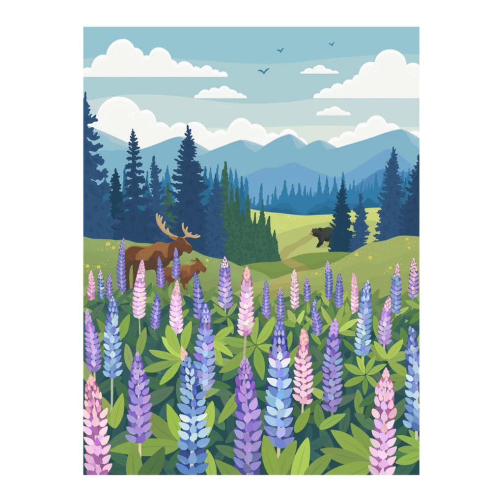 Step into a wild and whimsical meadow with this stunning 1000 piece puzzle from Villager featuring rolling hills blanketed in blue and purple lupines. Designed by Newfoundland artist Diana Pinnell, this vibrant scene is a love letter to the untamed beauty of nature—complete with curious moose, a wandering bear and trees swaying in the breeze. Perfect for outdoor lovers, this puzzle brings the magic of blooming fields and forest wildlife into your home, one peaceful piece at a time.