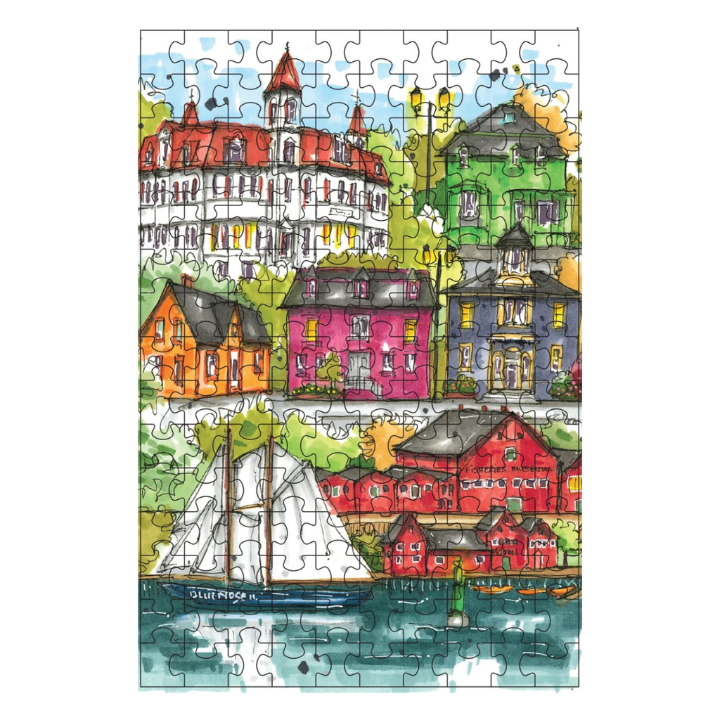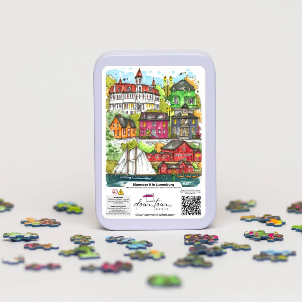 Note: pieces are micro puzzle size. Experience the maritime magic of Nova Scotia with this pretty Lunenburg mini luxury jigsaw puzzle from Downtown Sketcher. This stunning puzzle showcases the world-famous Bluenose II gracefully anchored in Lunenburg Harbour, inviting you to piece together a vibrant tableau of historic and cultural landmarks. Marvel at the bright façades of the colourful King Street houses, the charming dories floating gently by the wharf and the renowned Fisheries Museum of the Atlantic, which pays homage to the town’s rich seafaring legacy. The puzzle also features the iconic Adam & Knickle building—known for its deep roots in the local fishing industry—and the distinguished Lunenburg Academy, a National Historic Site perched on Kaulback Street. Lunenburg’s blend of striking architecture and storied waterfront represents one of Canada’s best preserved examples of a planned British colonial settlement, earning its designation as a UNESCO World Heritage Site.