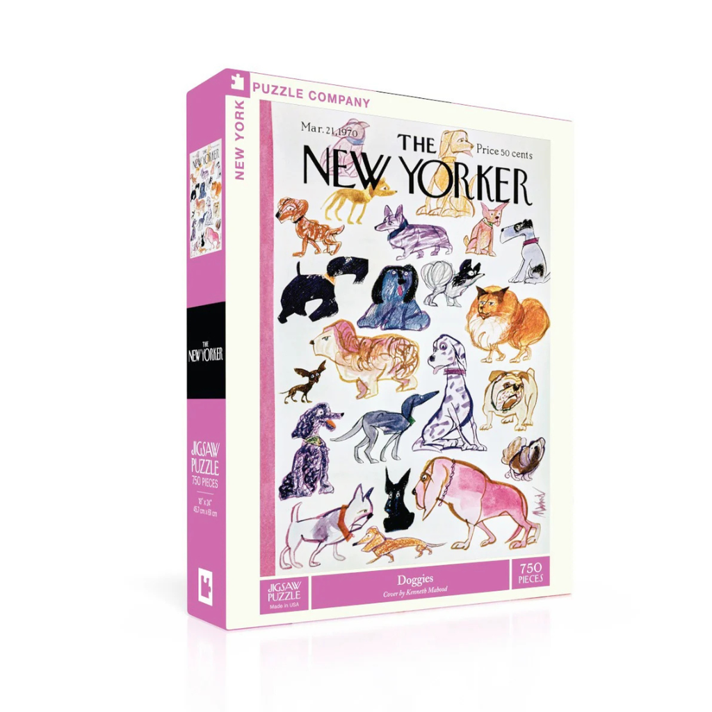 Delight in the whimsical world of dogs with the Doggies 750 piece jigsaw puzzle, inspired by a cover from The New Yorker magazine. Illustrated by celebrated cartoonist Kenneth Mahood, this charming artwork features a delightful array of dog breeds, from poodles and bulldogs to dalmatians and collies, all captured in a playful and humorous style. Set against a crisp white background, the design highlights the unique personalities of each pup, making it an irresistible choice for dog lovers and puzzle enthusiasts alike.