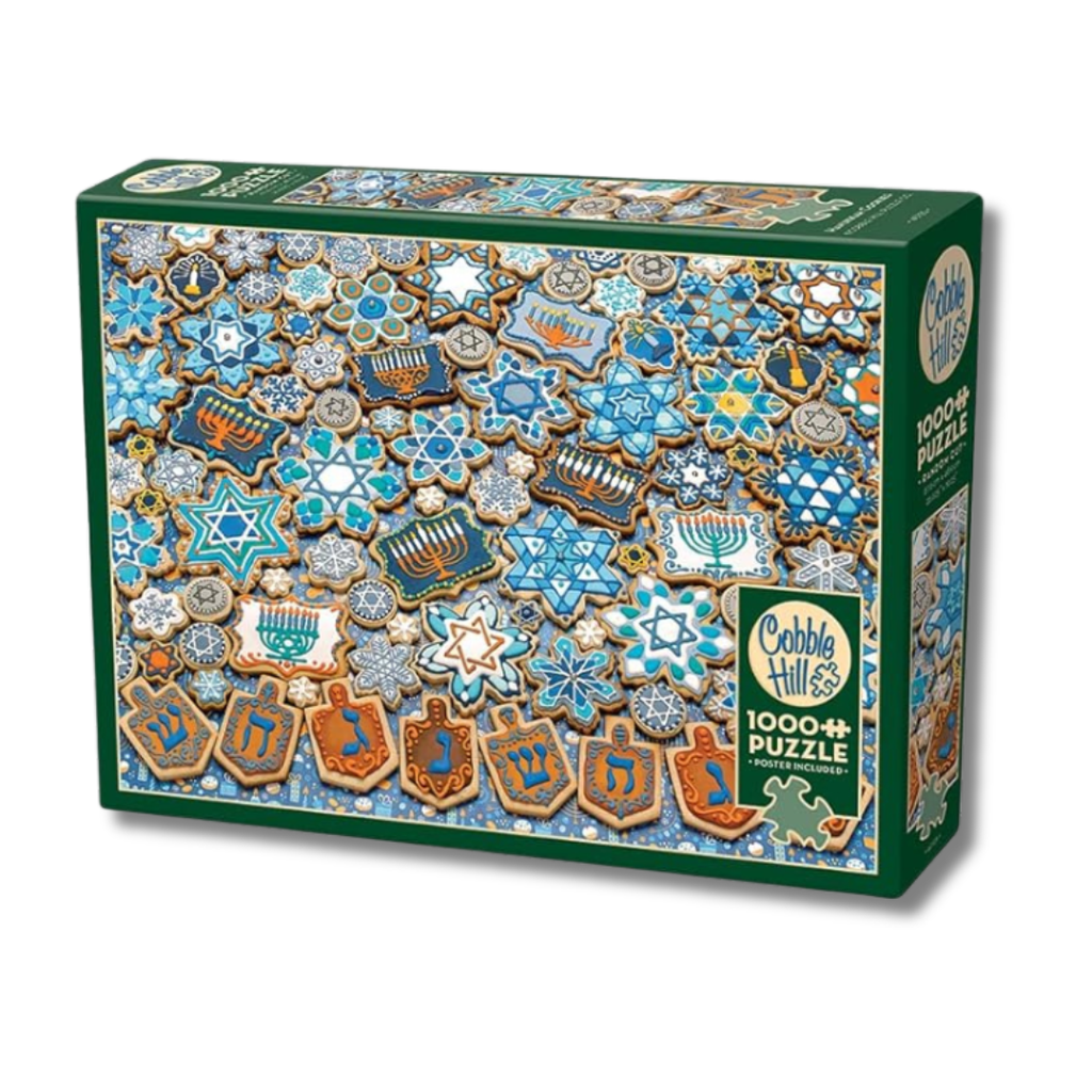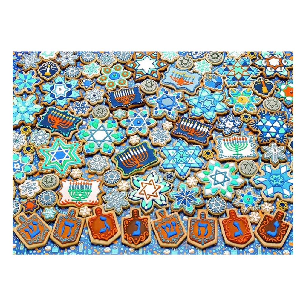 Shalom! Time to celebrate the holiest time of the year with these scrumptious cookies decorated for the Hebrew holidays! Celebrate the Jewish Festival of Lights with menorahs, dreidels and the Star of David. Hanukkah Cookies is a 1000 piece Truly Original Photo jigsaw puzzle by Cobble Hill Creations.