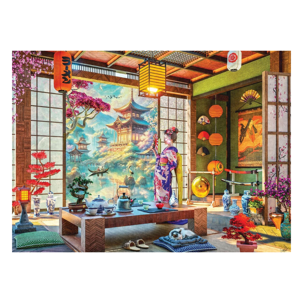 Step into serene elegance with Japan Tea Room 1000 piece jigsaw puzzle from Eurographics. A kimono-clad hostess, shoji screens, bonsai, paper lanterns and teaware set the scene while a dreamy temple landscape glows beyond. Calming colours, rich textures and tons of small objects make for a satisfying, mindful build and plenty of “just one more piece” moments.