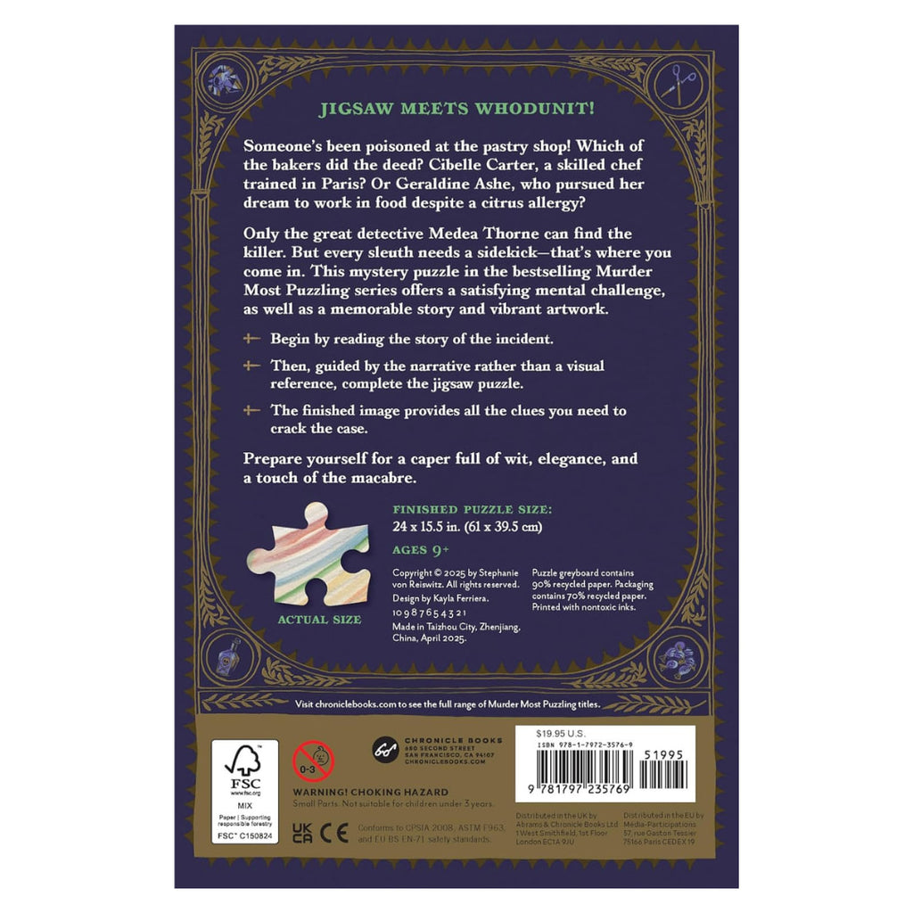 From the creator of the bestselling Murder Most Puzzling series of books and puzzles, this spin on the classic jigsaw puzzle invites you to solve both a jigsaw and a whodunit, offering hours of brainteasing fun! Someone's been poisoned at the pastry shop! Only the great detective Medea Thorne can find the killer. But every sleuth needs a sidekick - that's where you come in. This mystery puzzle offers a satisfying mental challenge as well as a memorable story and vibrant artwork. Begin by reading the story of the incident. Then, guided by the narrative rather than a visual reference, complete the jigsaw puzzle. Review the finished puzzle image to find all the clues you need to crack the case. Play solo or in a group. Either way, prepare yourself for a caper full of wit, elegance and a touch of the macabre!