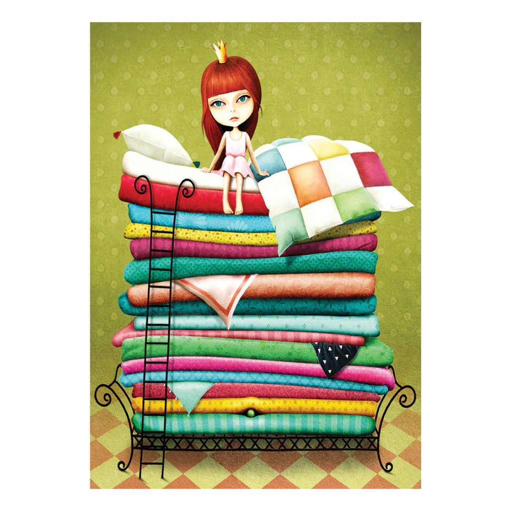 Princess On The Pea 1000 piece jigsaw puzzle from Enjoy is a pretty illustration of a fairytale classic brought to life. This delicate princess rests atop a towering stack of mattresses, unaware of the tiny pea beneath. The charming scene captures the magic of bedtime stories and childhood dreams.