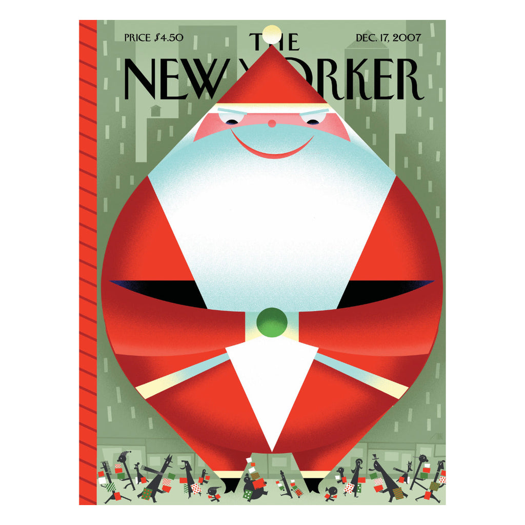 Experience the energy of the holiday season with Santa’s Little Schleppers, a 500 piece jigsaw puzzle featuring the December 17, 2007 cover of The New Yorker. This playful and bustling illustration captures an oversized Santa Claus watching in wonder as crowds of holiday shoppers race through a busy city, arms full of last-minute gifts. A humorous and heartwarming look at urban holiday chaos, this puzzle is perfect for fans of seasonal scenes, city life and classic magazine art.