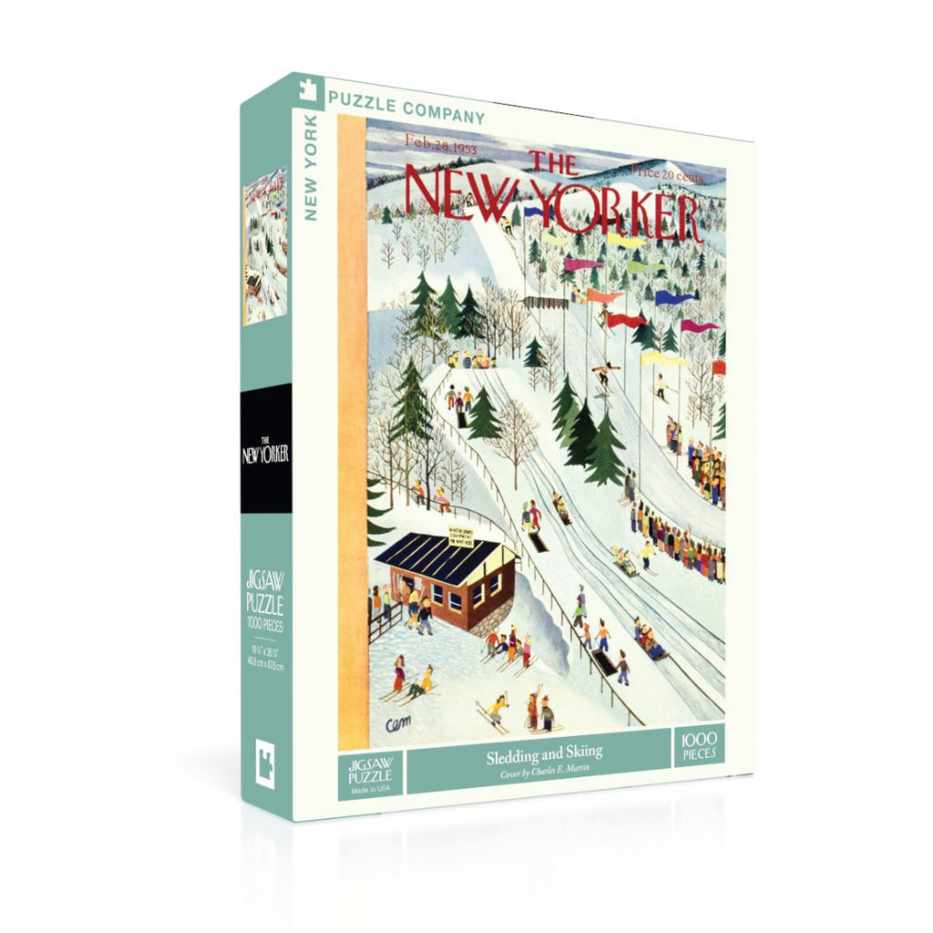 Hit the slopes from the comfort of your home with Sledding And Skiing, a 1000 piece jigsaw puzzle featuring the February 28, 1953 cover of The New Yorker by Charles E. Martin. This vibrant aerial illustration captures the joyful chaos of a bustling winter mountain scene, filled with skiers, sledders and winding trails alive with motion. The colourful crowd and intricate layout make this puzzle both visually delightful and satisfyingly challenging—perfect for winter lovers, vintage art fans and seasoned puzzlers looking for their next cold-weather project.