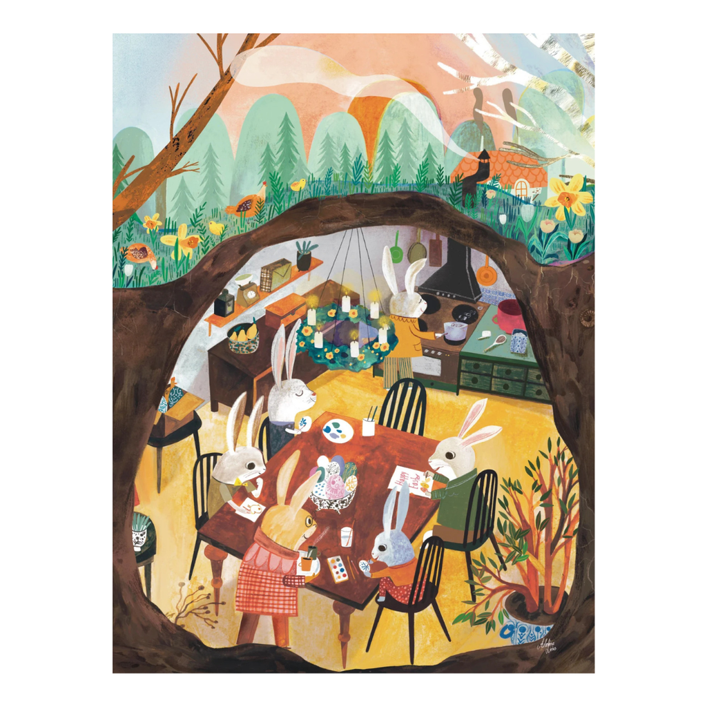 Spring preparations are well underway in this charming underground scene, where busy bunnies gather to craft, colour and share a lunch together. Tucked beneath the ground, a hidden world comes to life in Spring Preparations, a delightful 500 piece jigsaw puzzle illustrated by Adelina Lirius. Inside their cozy underground home, a group of rabbits busily prepares for Easter - dyeing eggs, making handmade cards and pausing to enjoy lunch together as springtime excitement fills the air. Every corner of the scene is rich with thoughtful detail, from colourful crafting supplies to half-finished projects and shared moments around the table. The illustration rewards close looking and invites slow, satisfying puzzling as the rabbits’ warm, communal world gradually comes together.