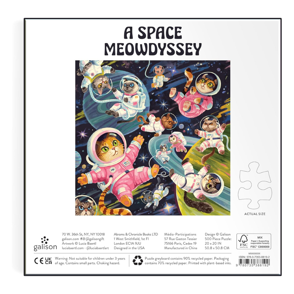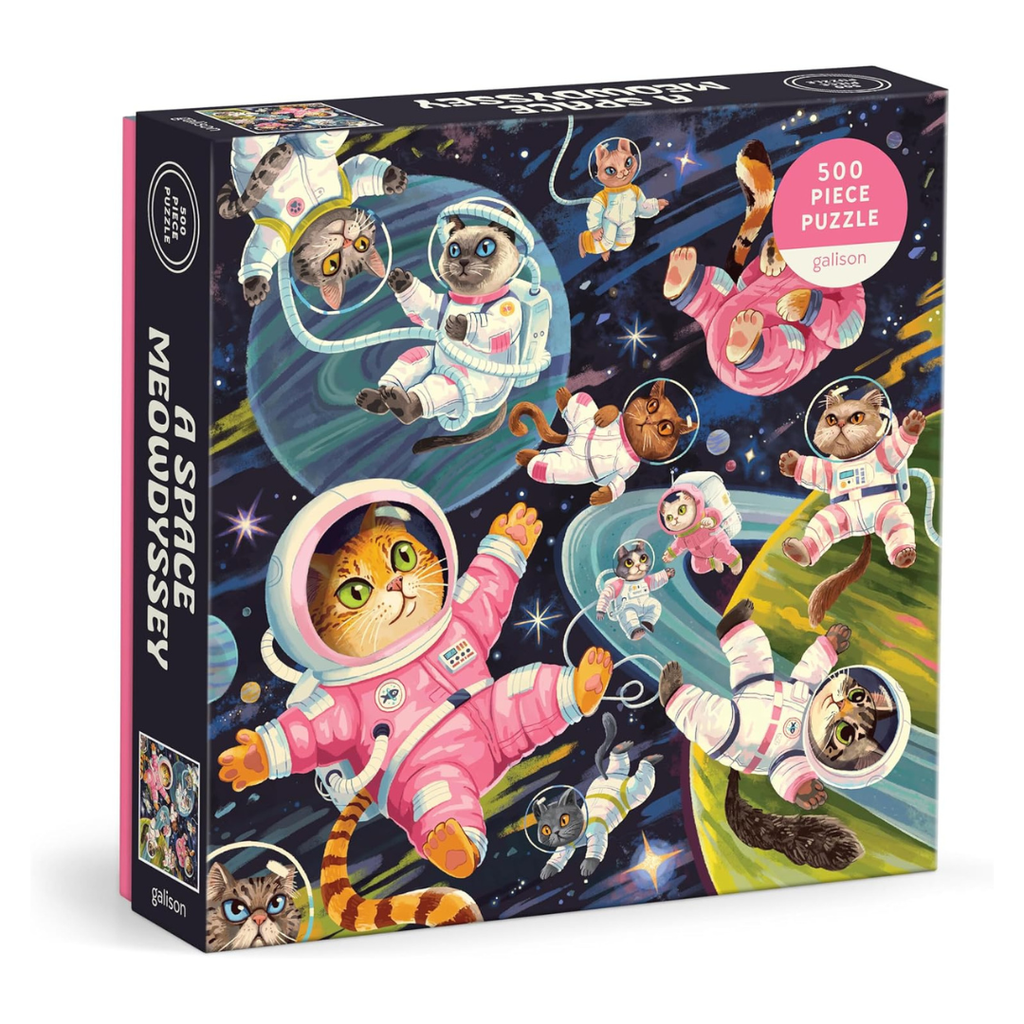 Suit up for an interstellar adventure with the A Space Meowdyssey 500 piece jigsaw puzzle from Galison. This colourful, imaginative puzzle features cats as daring astronauts exploring the cosmos. Piece by piece, you'll uncover a playful galaxy filled with floating feline explorers, starry skies, planets and whimsical space gear. It's the perfect journey for cat lovers and dreamers alike - no spaceship required.