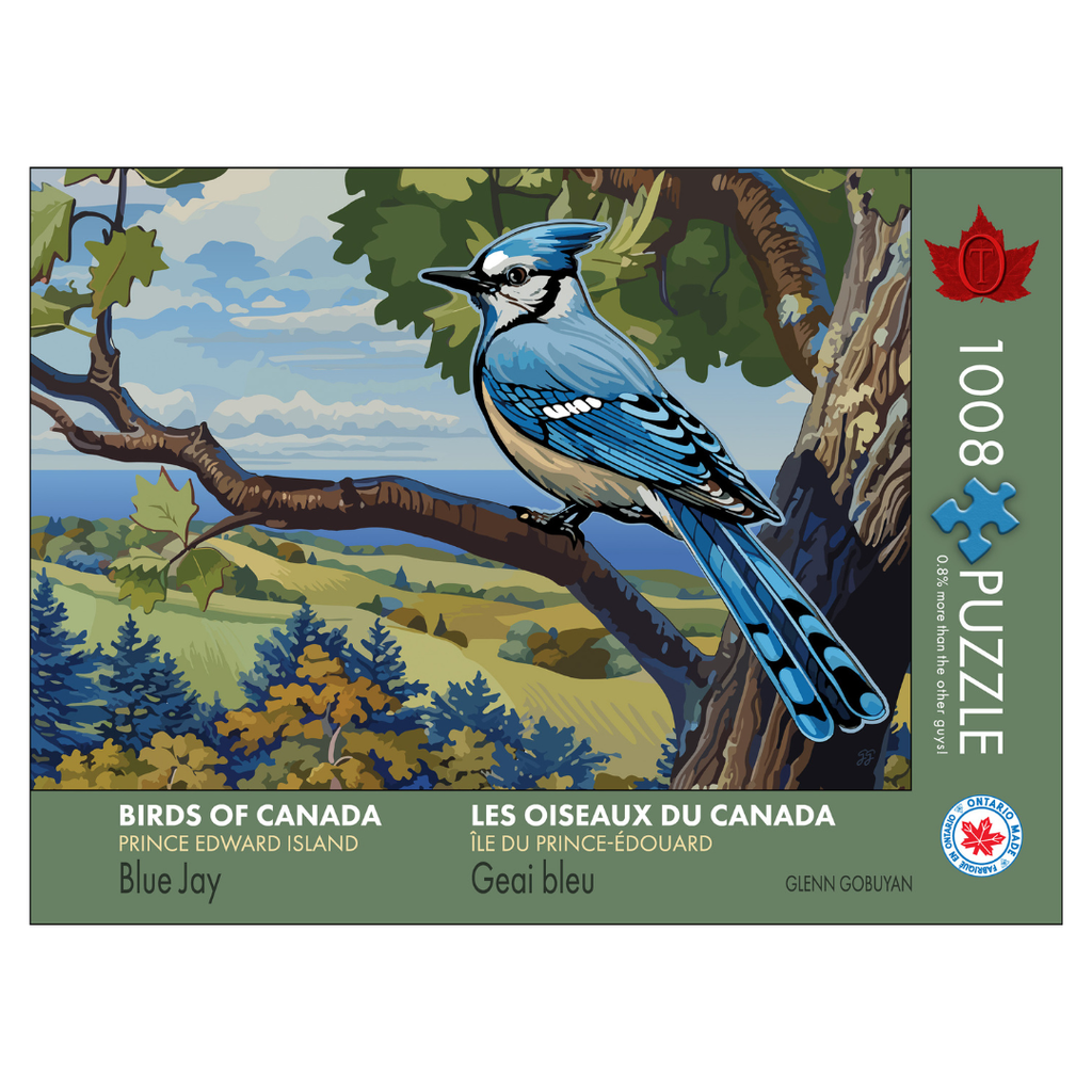This beautiful Blue Jay 1008 piece jigsaw puzzle is part of the Birds Of Canada series from TheOccurrence by artist Glenn Gobuyan. This highly intelligent and noisy songbird is perched on a tree branch, resplendent in its strikingly bright blue, white and black plumage.