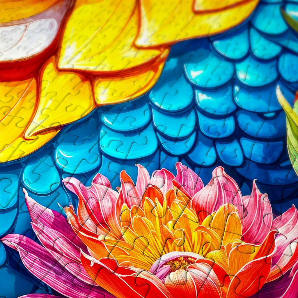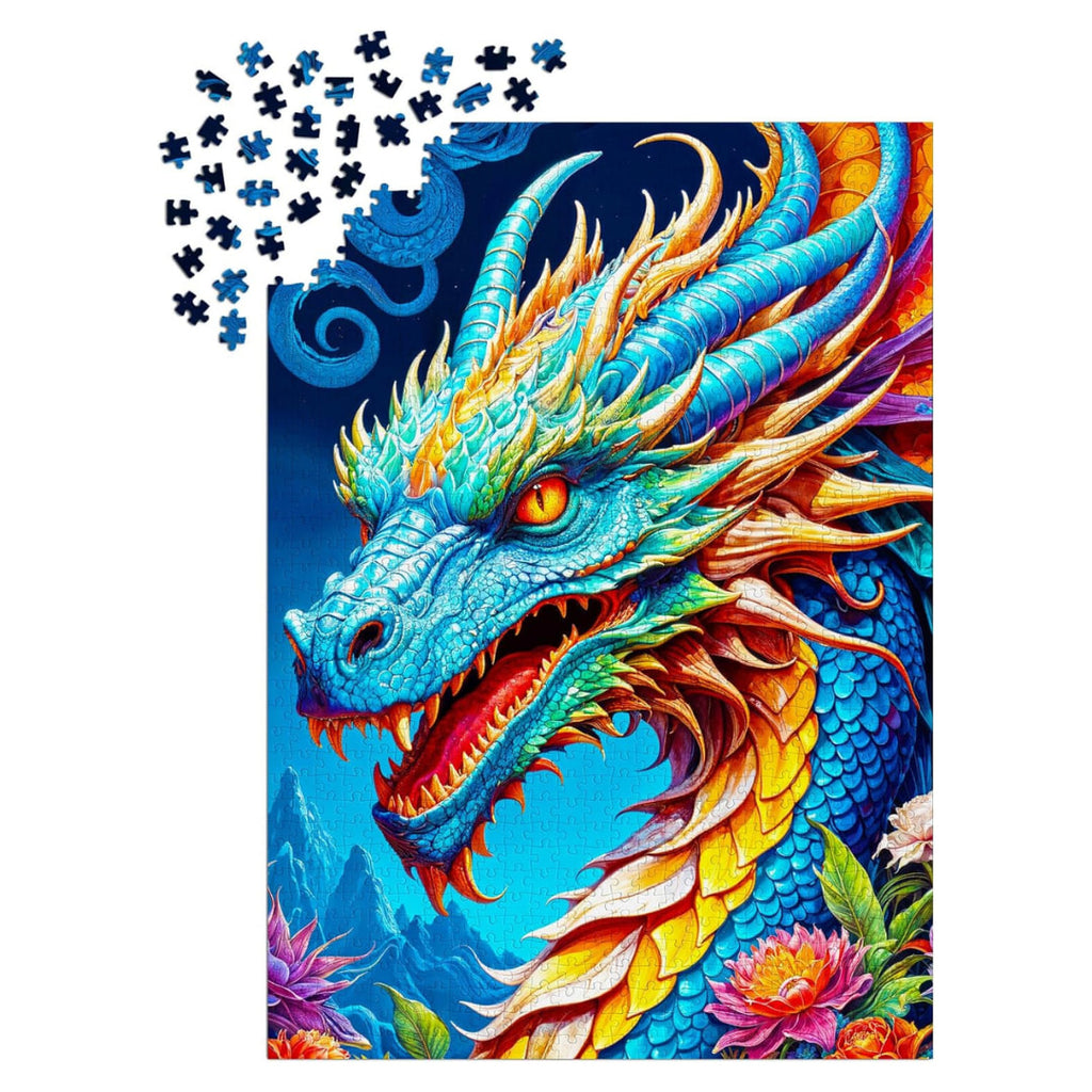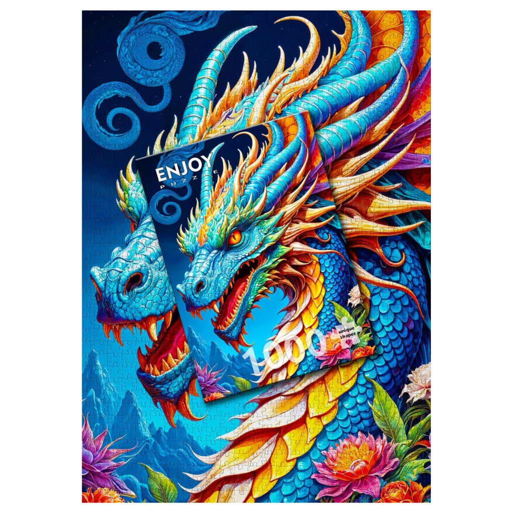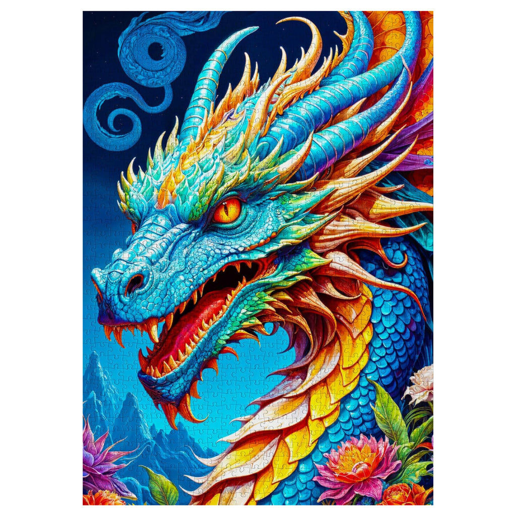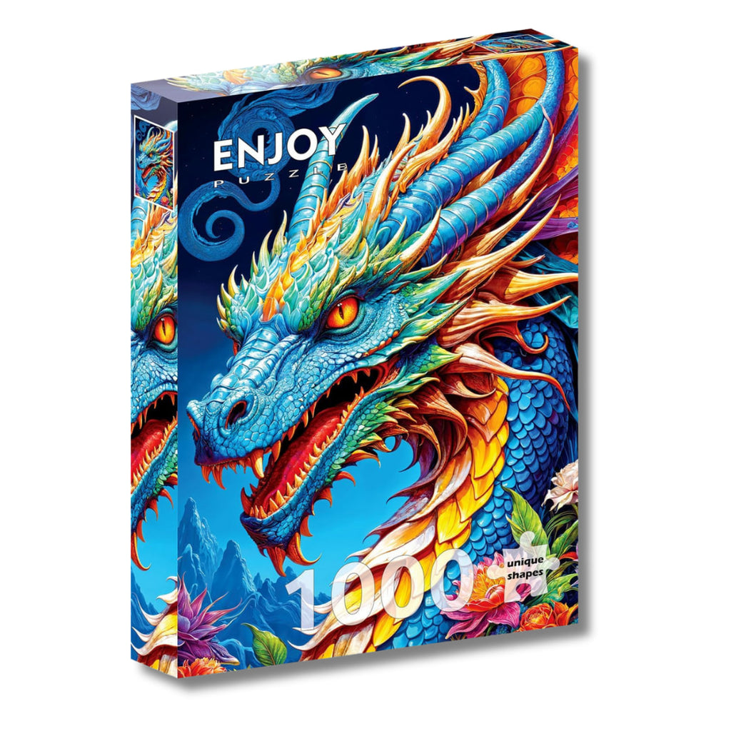 A breathtaking vision of strength and serenity, this striking blue dragon rises with regal horns and vibrant orange highlights. Surrounded by delicate lotus flowers in the foreground, it gazes over a tranquil mountain landscape. Bold, colourful and full of mystique, this Blue Dragon 1000 piece jigsaw puzzle captures the harmony of power and peace in a stunning fantasy scene.