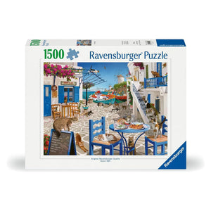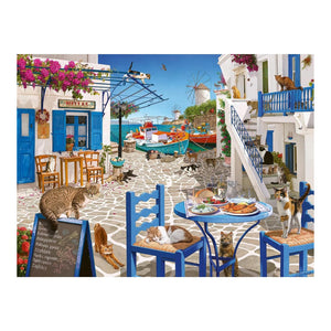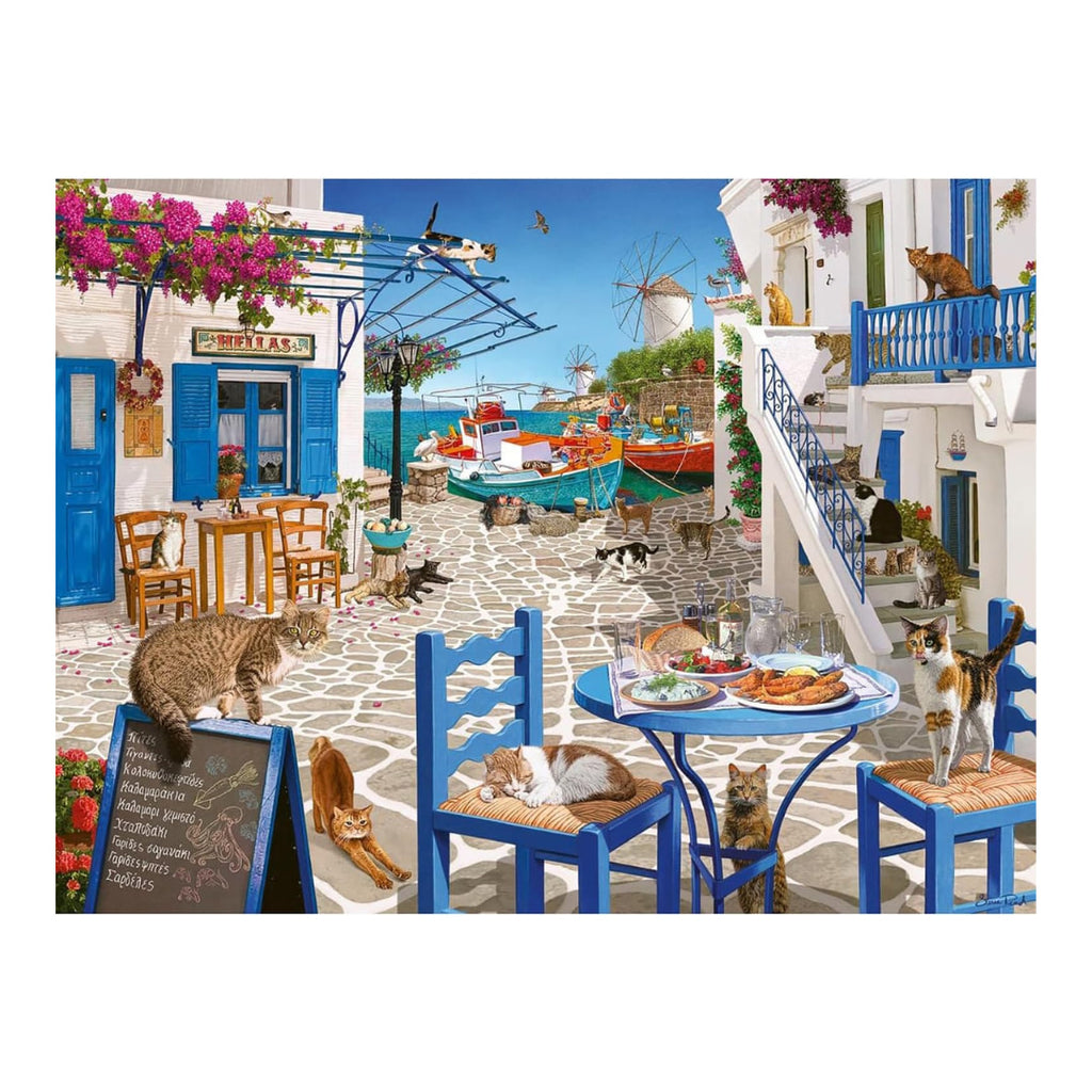 Bask in the glorious sunshine on this gorgeous Greek isle amid a bevy of furry felines in Ravensburger's Cats of Mykonos 1500 piece jigsaw puzzle! Journey to the Cyclades Islands off the coast of Greece and find a piece of paradise in this lovely puzzle by artist Steve Read. One of the unique charms of Mykonos is its vast population of stray cats. With about 10,000 residents and about 50,000 felines, imagine exploring winding alleys with sleeping cats strewn about! The resourceful felines frequent the harbour where local fishermen share fresh cast-offs from their latest catch.