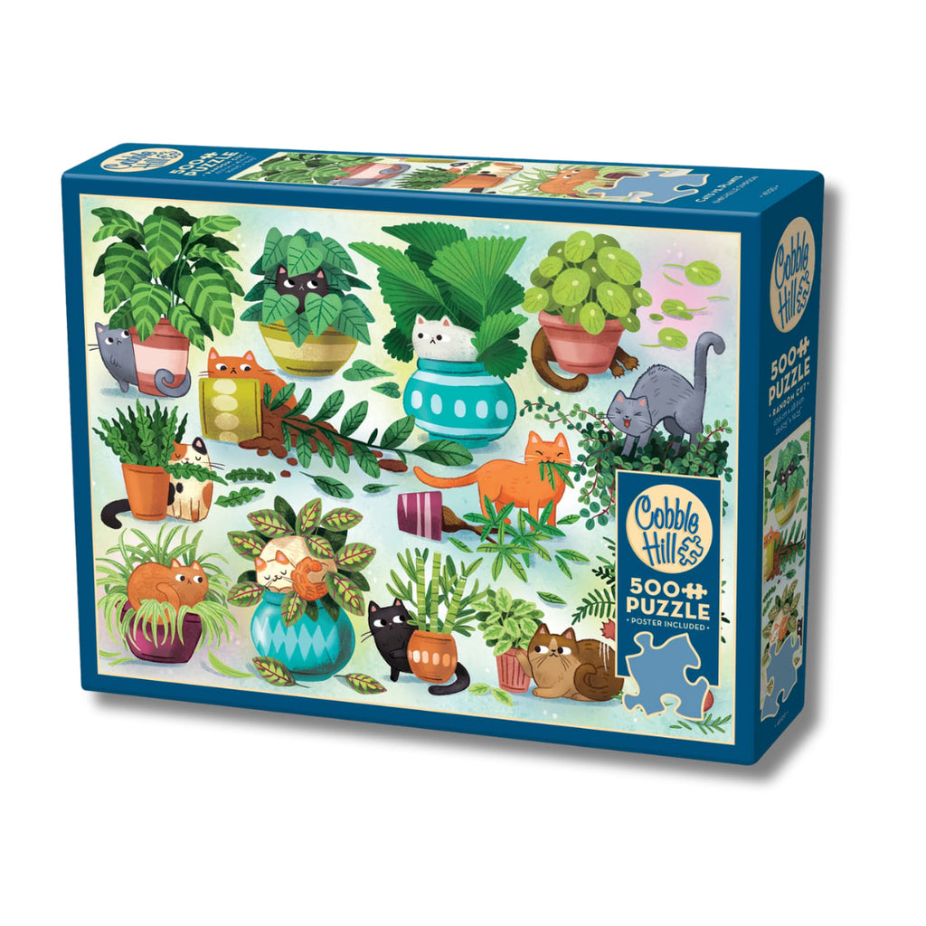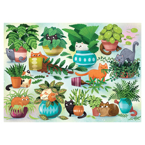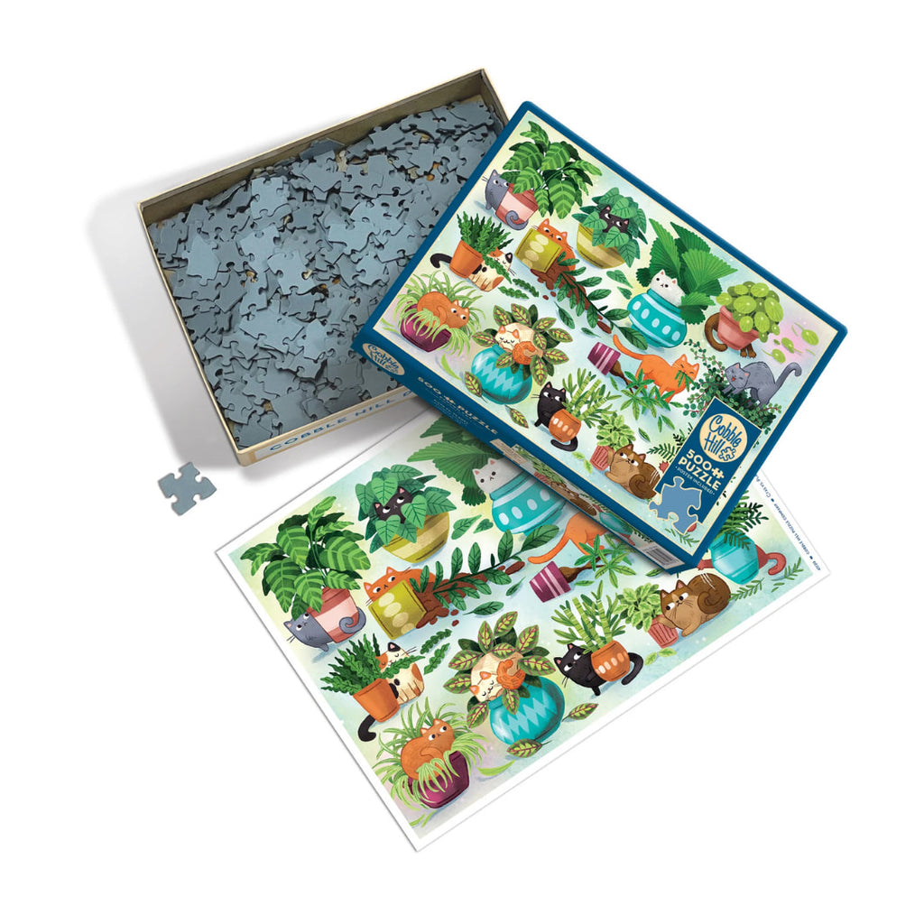 Cats Vs. Plants 500 piece jigsaw puzzle from Cobble Hill is a fun collage of furry friends and their silly antics. Find these felines hiding in the planters, using the pots as litter pans, and 'leave'ing the chaos with a little nap.