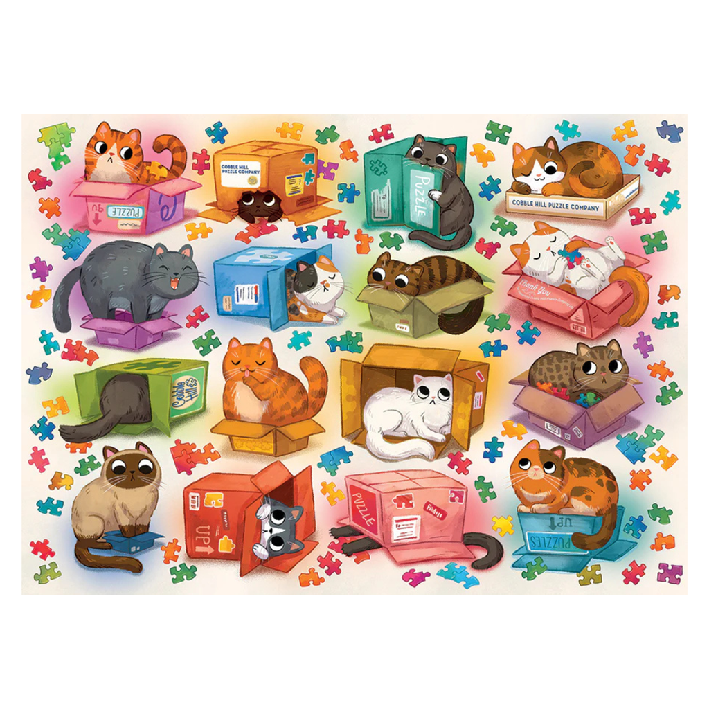 Talk about a sweet 16! It’s Cats vs. Puzzles, a purrfect 1000 piece celebration of chaos, cuteness and coyness. Sixteen mischievous cartoon cats have claimed their boxes...or at least tried to! One’s napping, another’s stretching, a little grey one is tumbling and, of course, there’s that one determined kitty who can only fit his front paws in a box that's clearly too small. Our personal favourite? The sneaky black cat hiding under a box, with just his tail and paws sticking out - trying to snag a puzzle piece when no one’s looking! Rainbow coloured puzzle pieces are scattered everywhere, adding to the vibrant chaos. It's box loving mayhem at its finest, and every expression is full of feline fun. Whether you're a cat lover, a puzzle fan or both, you're guaranteed to smile with every piece you place.