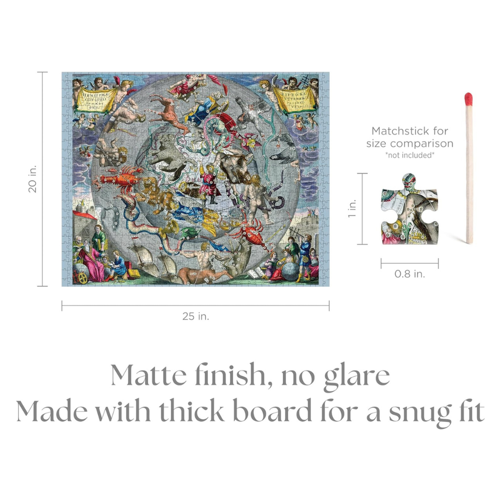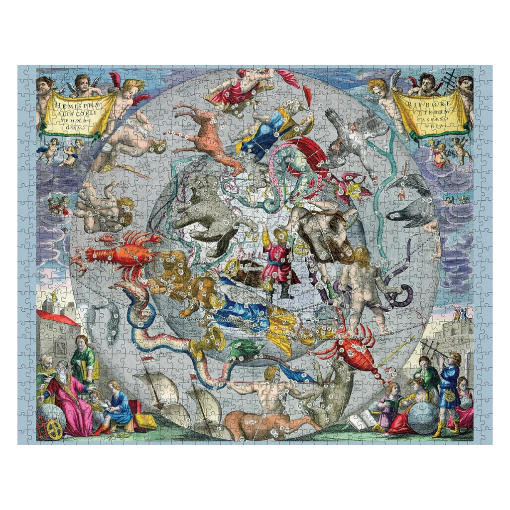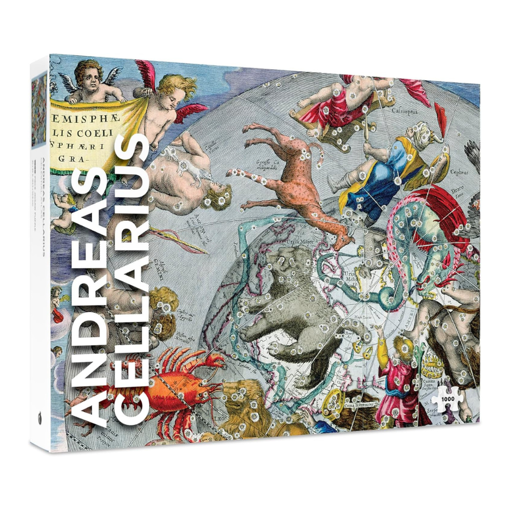 The scenographic celestial chart shown on this 1000 piece jigsaw puzzle was published in 1660 by Johannes Janssonius of Amsterdam as one of 29 hand-coloured double-folio maps included in the Harmonia Macrocosmica. Here, Cellarius positions the viewer deep in outer space, gazing down on constellations of the Northern Hemisphere and the lands and waters below them. This perspective is based on scientific theory of the day, and allegorical vignettes in each corner shine a light on then-modern equipment for observing the heavens.