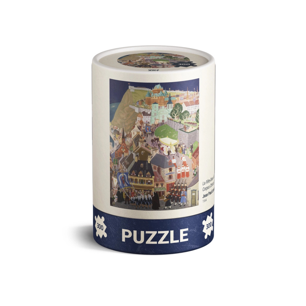This imposing work by Jean Paul Lemieux is constructed from an accumulation of details, characters and actions. Without being a caricature, it presents, with a few touches of humour, the omnipresence of the Catholic religion in Quebec in the 1940s. Looking more closely, we see certain characters whose posture reflects their indifference to the action taking place. The artist himself is depicted at the door of a tavern he owns, waiting with his arms crossed for the ceremony to end. The S-shaped road in the image leads the eye across the canvas to savour its fine details. Lemieux offers us a superb aerial perspective, allowing us to look down slightly on the magnificent city of Quebec.