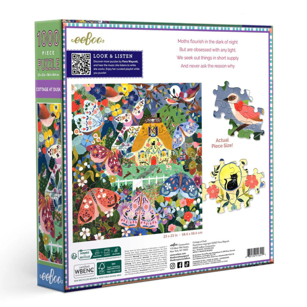 Artist Flora Waycott brings the night alive with this fanciful explosion of colourful moths and flowers in Cottage At Dusk 1000 piece jigsaw puzzle from eeBoo.