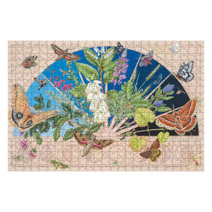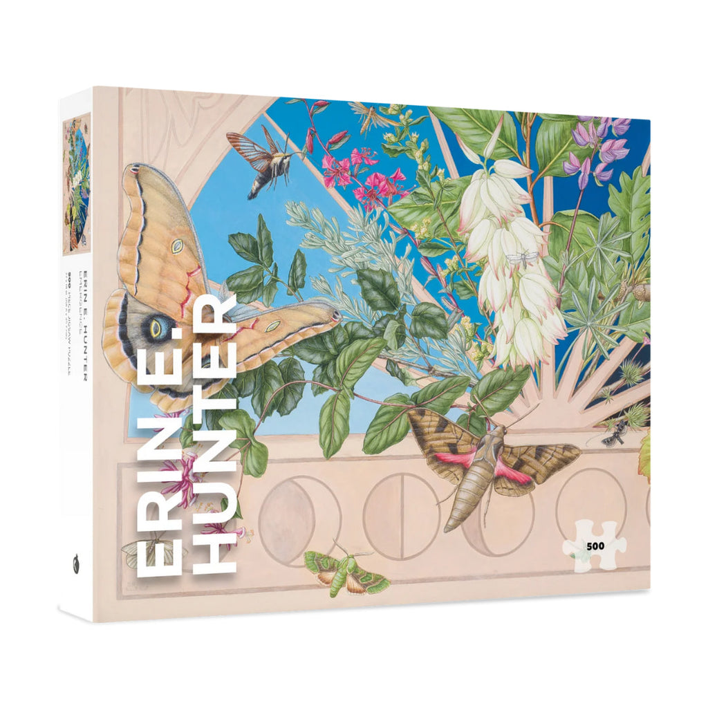 From dawn to darkest night, Nature is alive with activity. In Emergence 500 piece jigsaw puzzle, artist Erin E. Hunter brings that energy inside her window for a closer look. The plants depicted are larval food sources for the 20 moth species flying about, their details exquisite, with the phases of the moon underscoring the precious nature of each life stage and the passage of time.