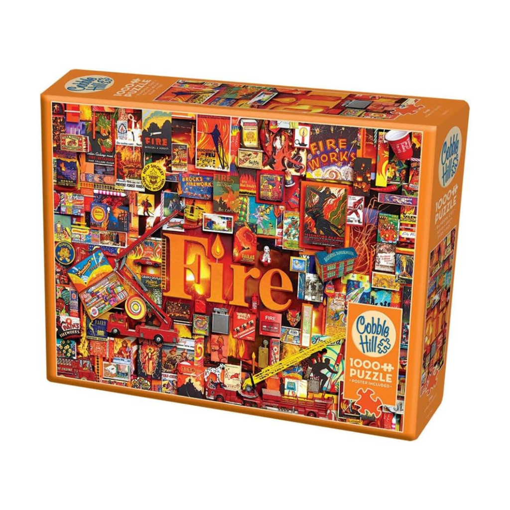 This 1000 piece jigsaw puzzle is covered in fiery reds and flammable imagery, highlighting the four classical elements of Water, Earth, Air and Fire.