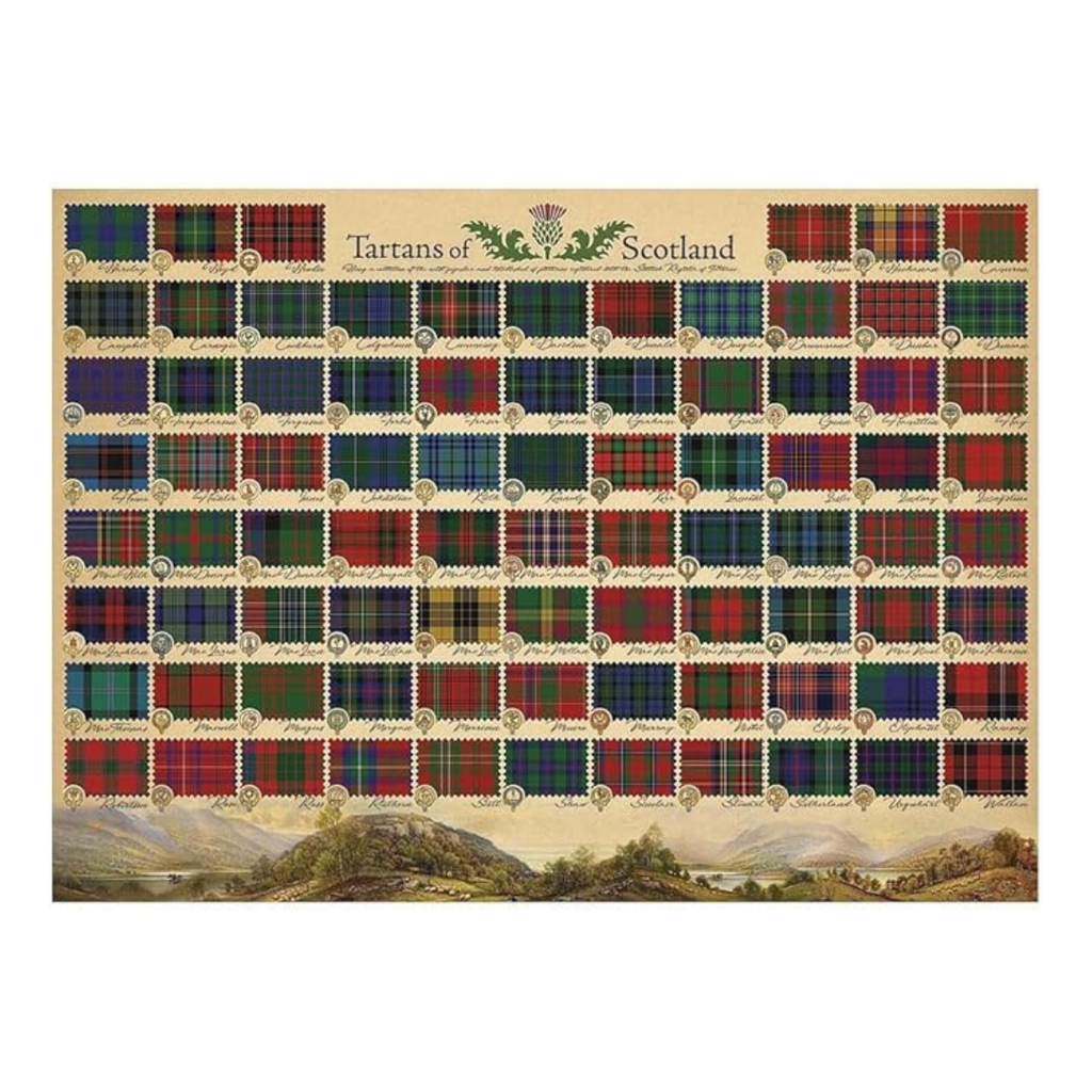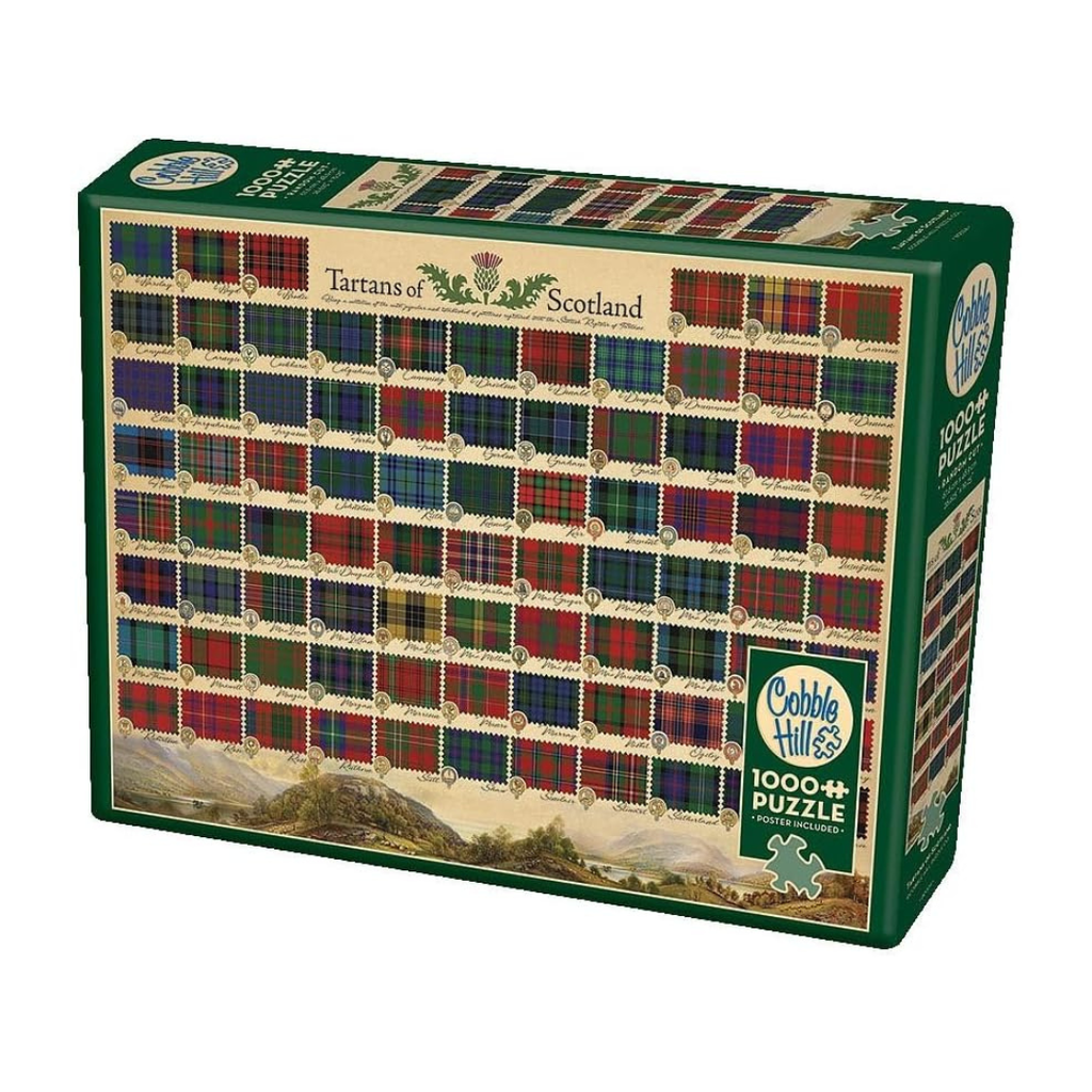 Designed by Cobble Hill Creations, Tartans Of Scotland 1000 piece jigsaw puzzle associates the beautiful patterns with surnames from popular Scottish family names.