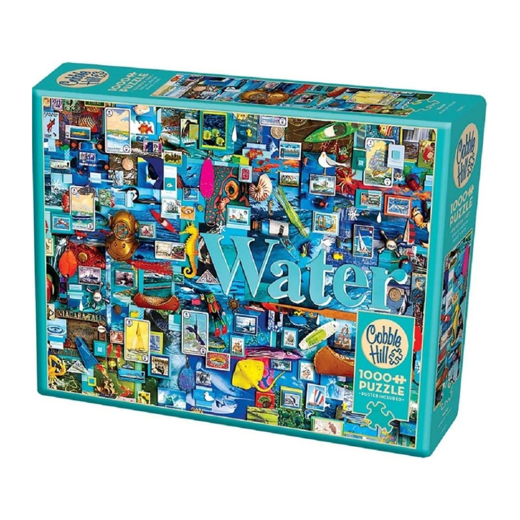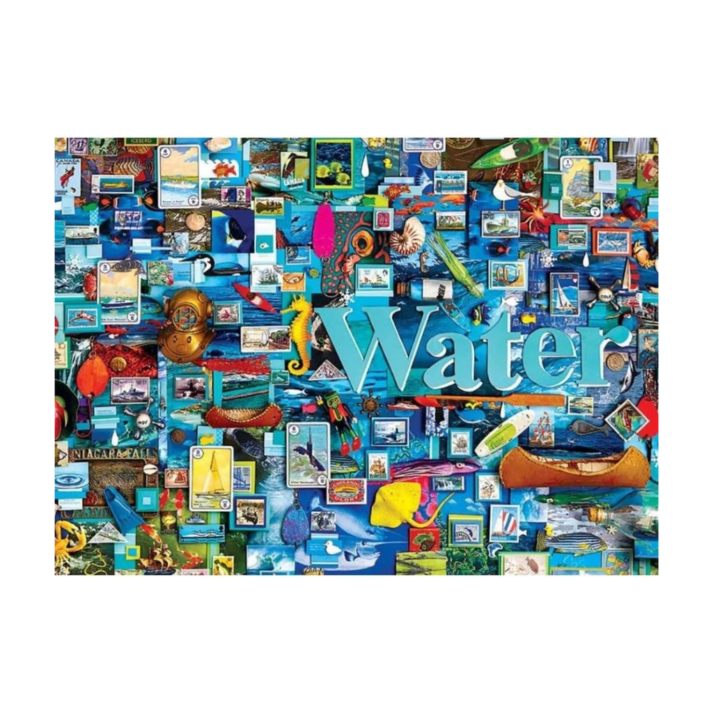 This 1000 piece jigsaw puzzle is covered in deep blues and nautical imagery, highlighting the four classical elements of Water, Earth, Air and Fire.