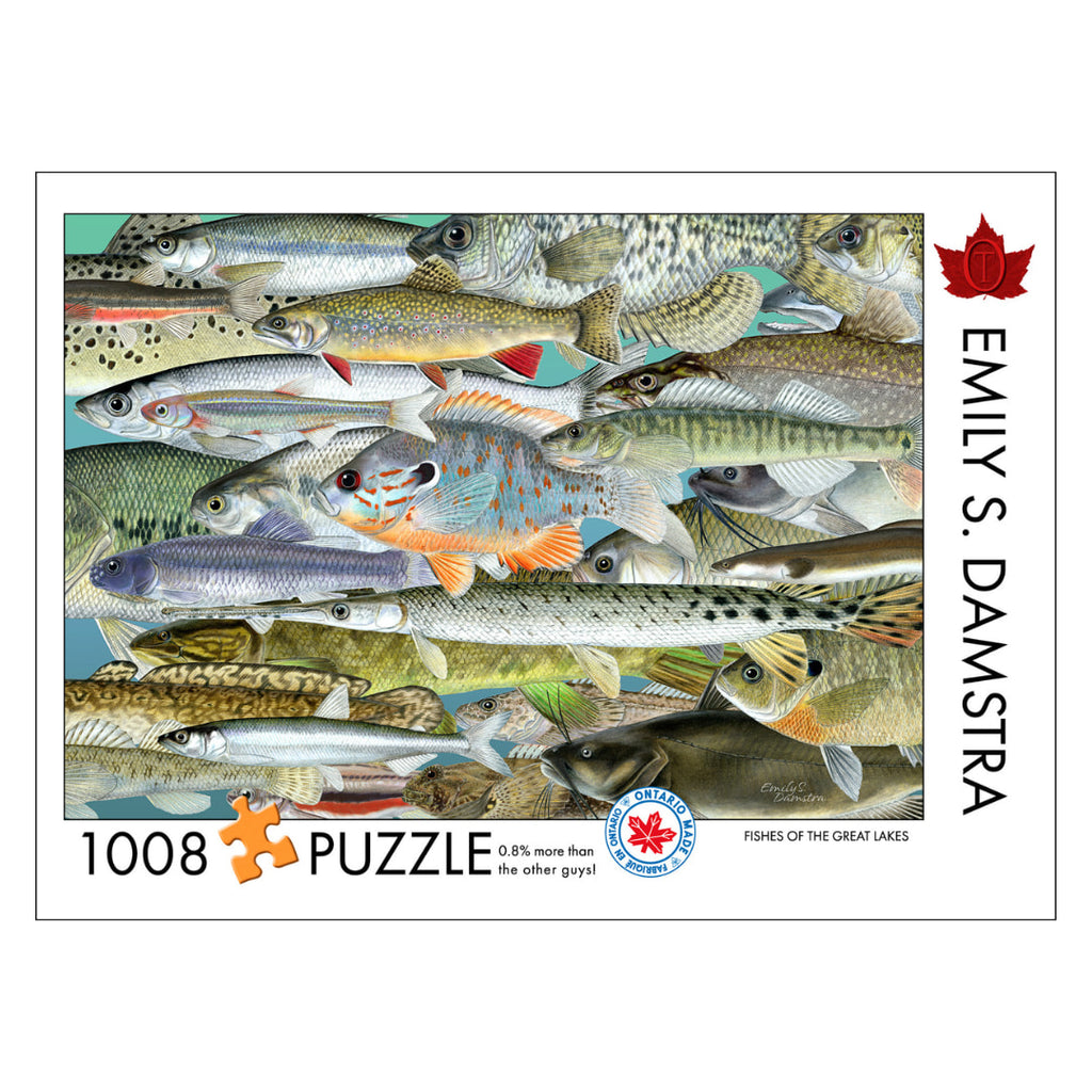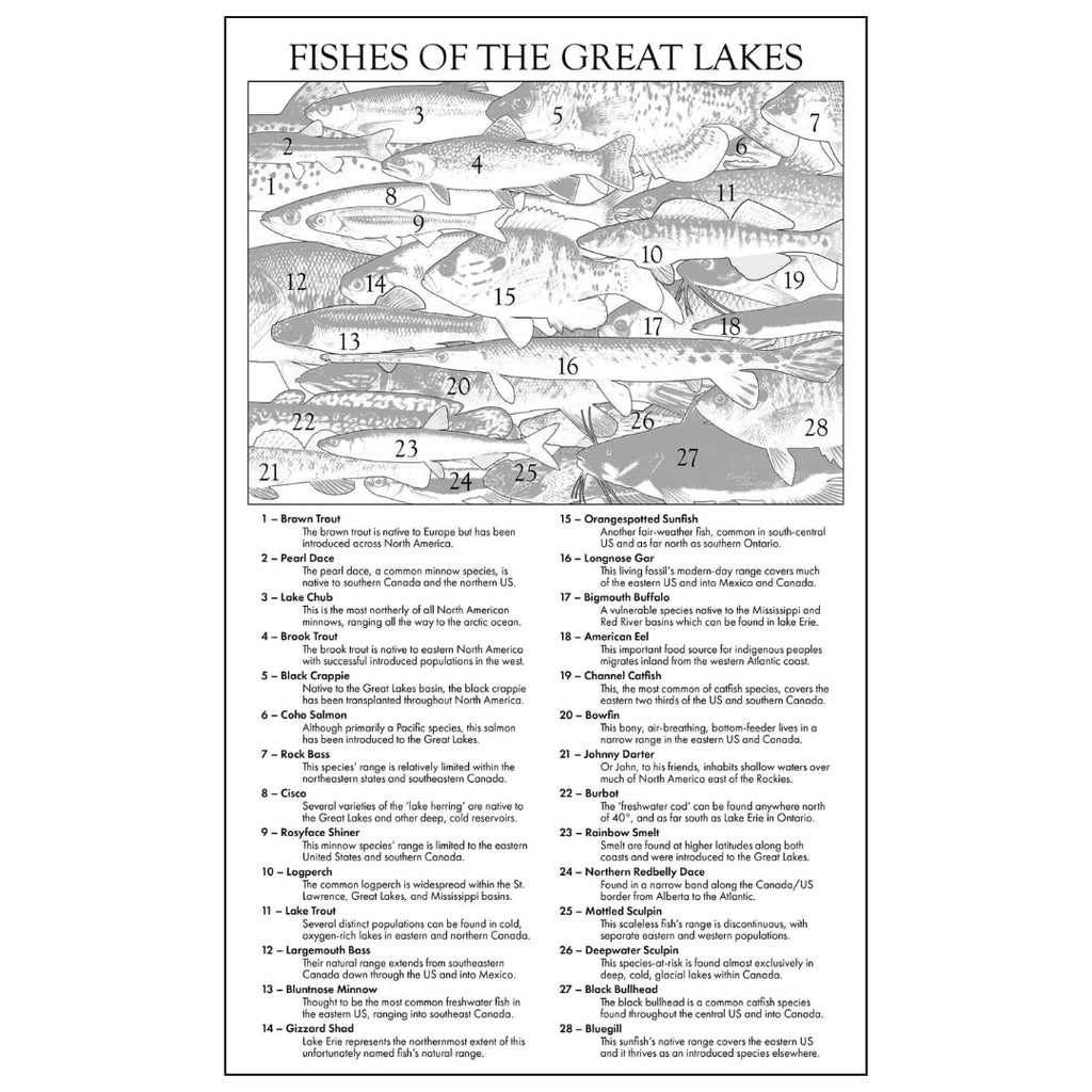 This collage includes some of Emily S. Damstra's Great Lakes watershed fish illustrations, many of which appear in the book 'Guide to Great Lakes Fishes' by Gerald R. Smith. Included in the package is a legend of all the fish species featured.