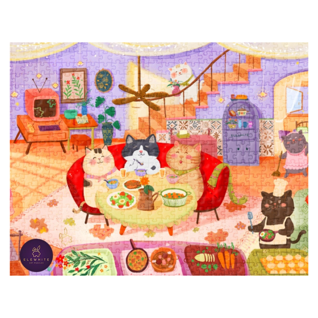 Cat lovers, unite! Meow Moments is a 500 piece jigsaw puzzle for those who want to dive into the cuteness of a purrfect life scene. Enjoy the puzzle carpet, fish bones on the table and a lovely snapshot of everyday cat companionship.