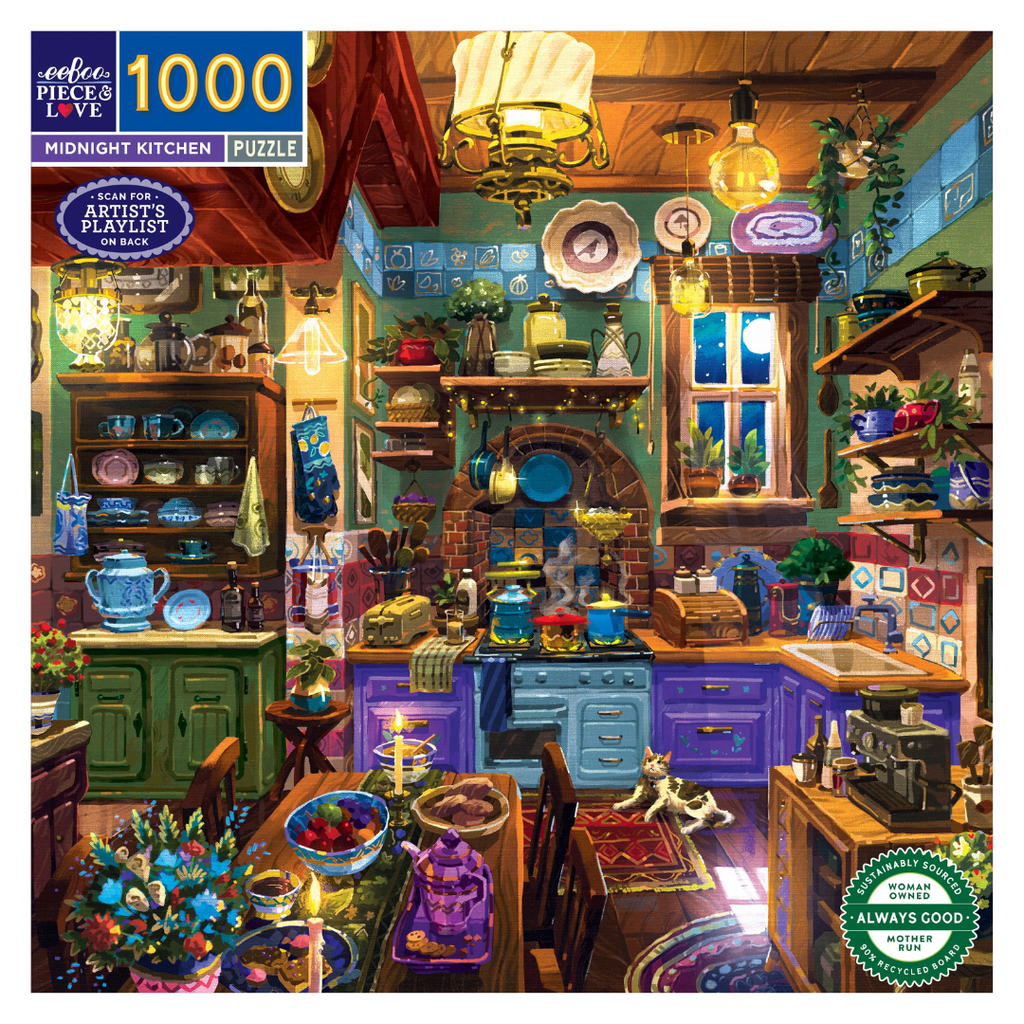 Midnight Kitchen 1000 piece jigsaw puzzle captures the delicious moody calm of a midnight kitchen. Enjoy its meticulous details: shelves of artful ceramics, steam from the pots on the stove and a patch of moonlight on the floor.
