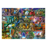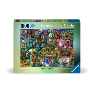 This magical bookshelf brings historic tales to life! A spectacular gothic castle towers in front of these crowded bookshelves. Knights, shieldmaidens, lords, ladies, wizards, fairies and mythical creatures portray their spellbinding stories, transporting us across land and sea. This extraordinary image has been especially created for Ravensburger by Aimee Stewart.