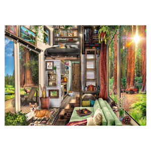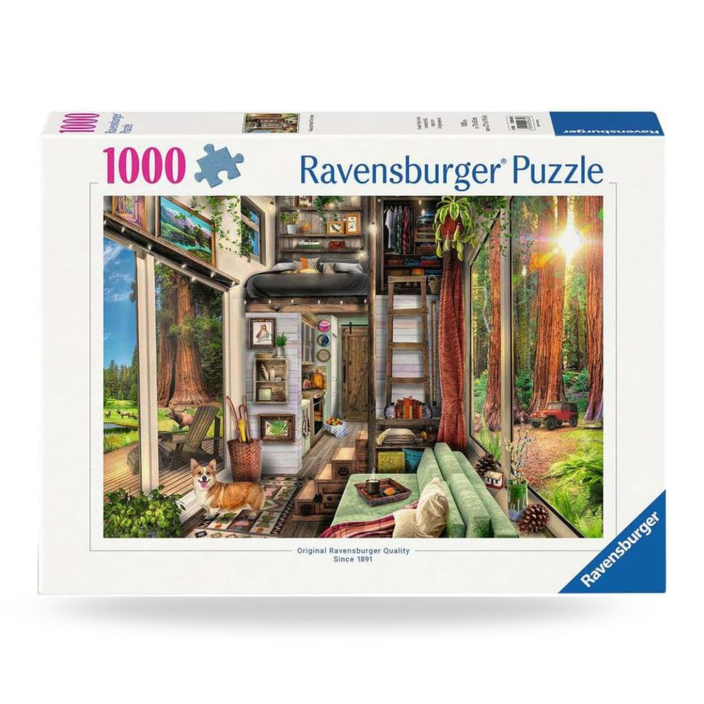 View the vastness of the tallest trees and wildlife wonders from your diminutive dwelling in Ravensburger's Redwood Forest Tiny House 1000 piece jigsaw puzzle! Welcome to the wonders of life in the woods! Everything you need is in this tiny space — a comfy couch, a compact kitchen and a low-maintenance loft with breathtaking scenery a daily occurrence. Your cute corgi Murphy wants to go outside and herd the elk, but he’ll just have to be happy watching. With the magnificent redwoods towering all around, you’re grateful every day to live amid this soul-soothing sanctuary. This one makes a perfect puzzle for the nature lover on your list!