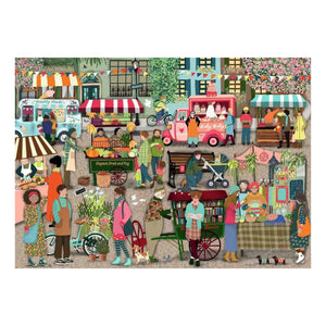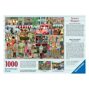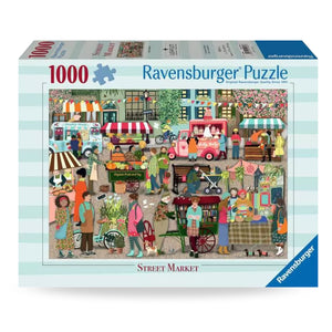 Come by the Street Market for food, friendship and fun in Ravensburger's charming jigsaw puzzle by artist Angela Holland! There’s something for everyone, from organic fruit and veg, to baked goods, books and bouquets. A hand-knit gift may save the day, while an ice cream treat is always welcome! Bring your pet, and meet a friend or make a new one; it’s a perfect place to connect and share time together.