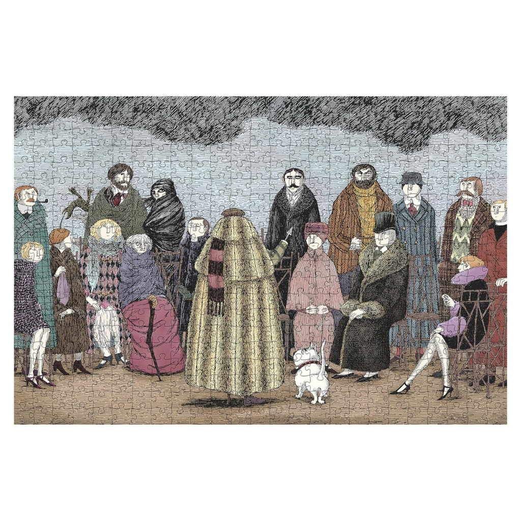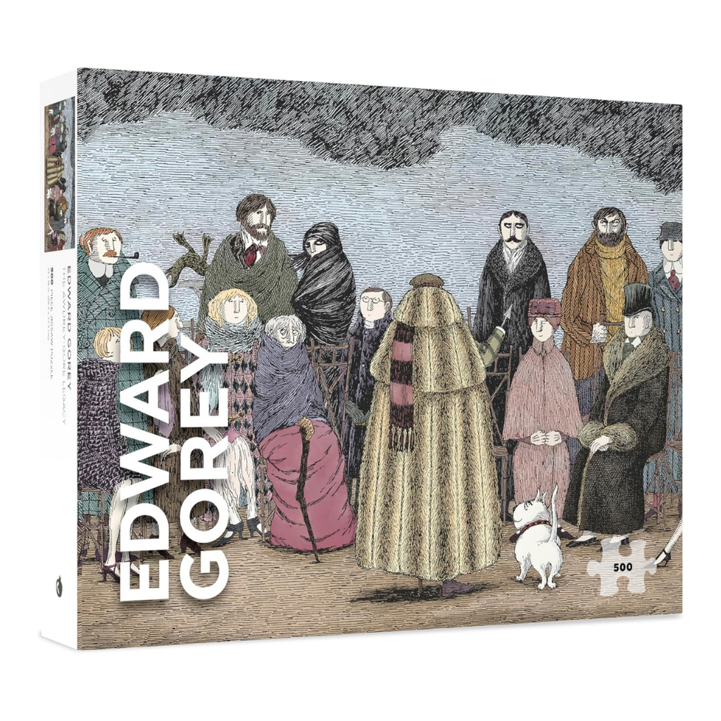 This image by Edward Gorey, taken from his murder mystery hit, The Awdrey-Gore Legacy, provides a hint about the murder of Miss D. Awdrey-Gore, a 97-year-old writer of detective stories. Is there a clue hidden among the intriguing characters in this scene?