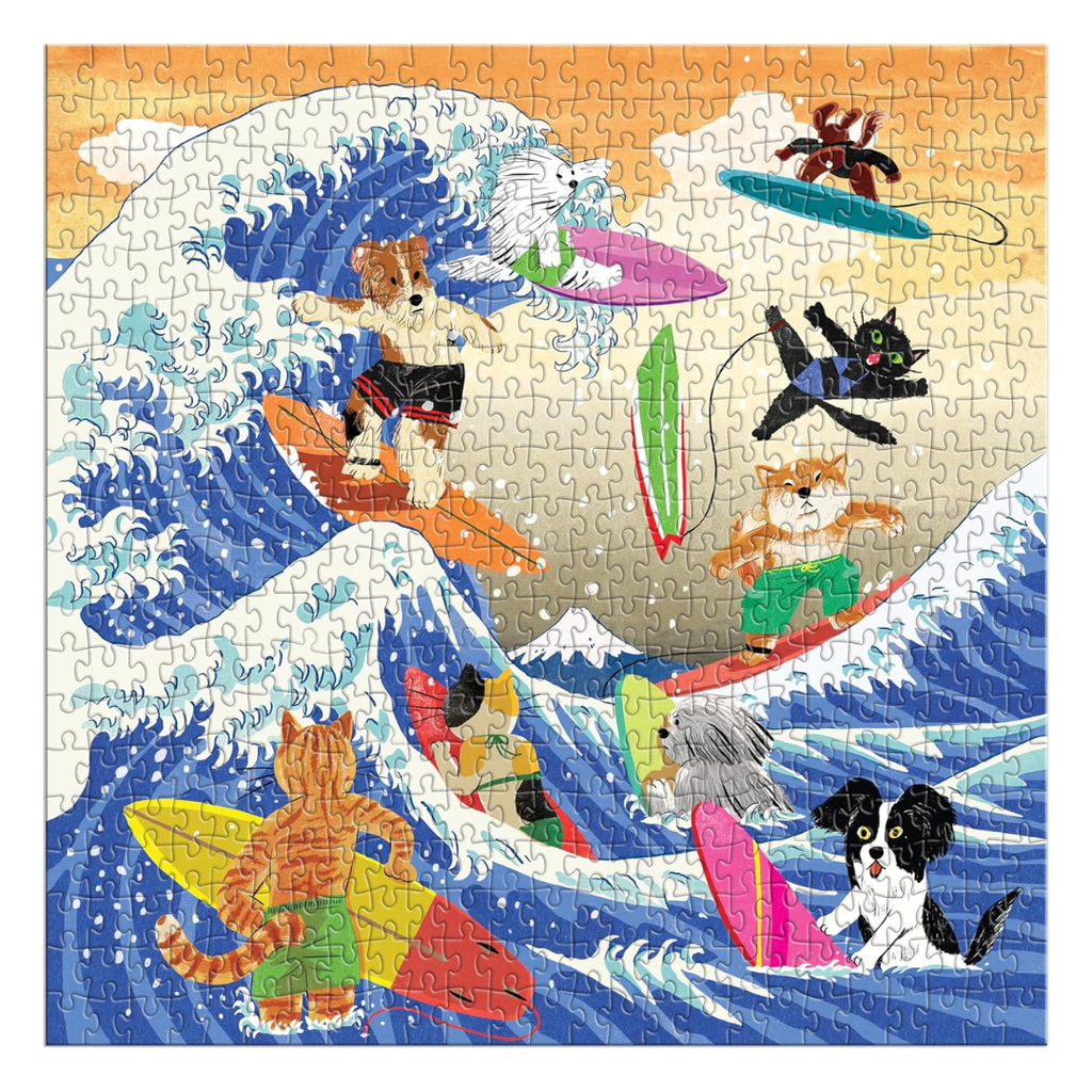 Make a splash with The Great Surf 500 piece jigsaw puzzle from Galison, where playful pets ride the waves in a vibrant ocean scene bursting with energy and charm. This delightful puzzle showcases adventurous cats and dogs surfing a massive wave, each showing off their own style - from confident corgis hanging ten to fearless felines carving through the sea. It's a joyful celebration of beach life and four-legged fun.